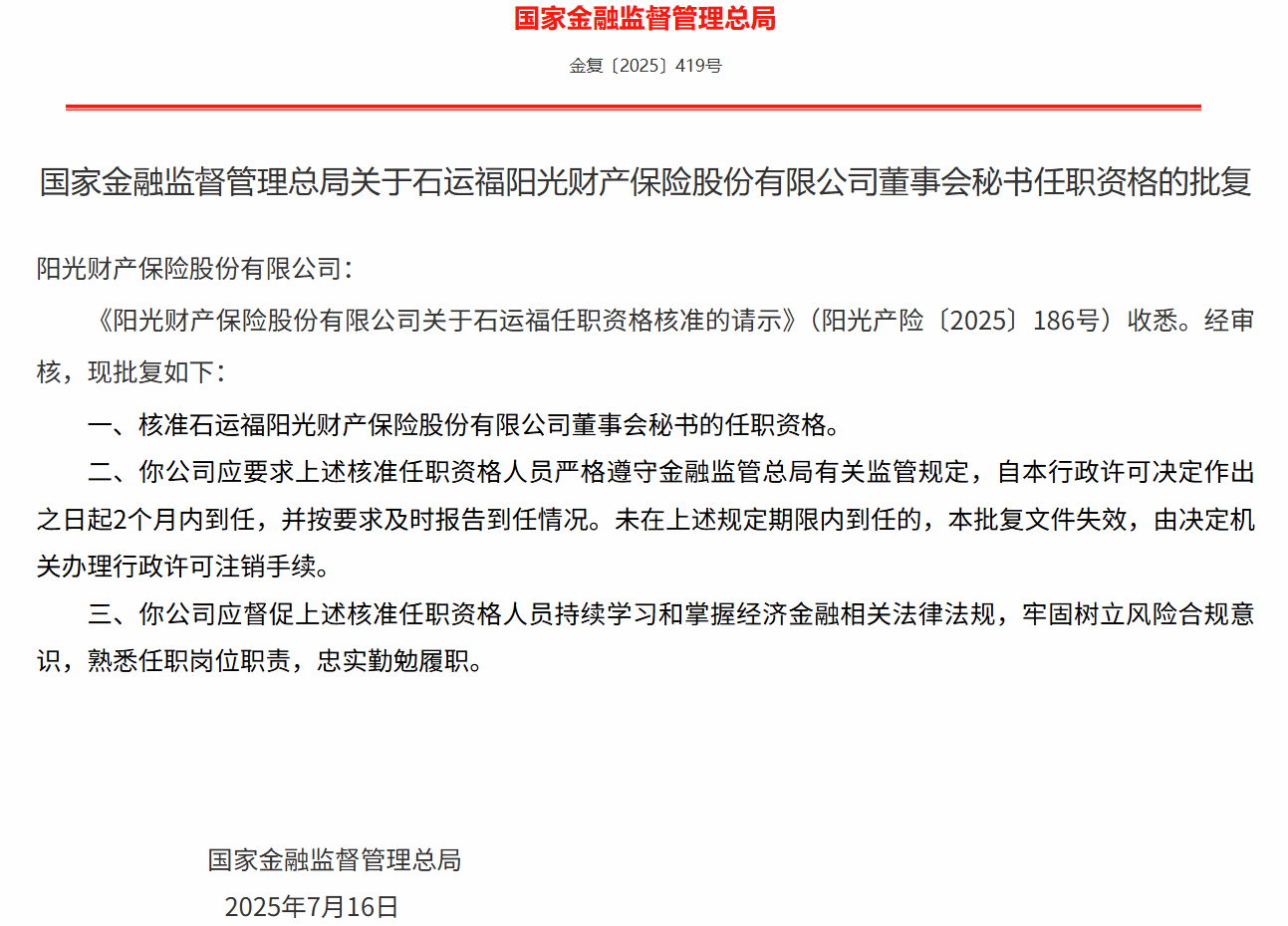 2025年7月30日,国家金融监督管理总局发布任职批复,为阳光财险二十年发展历程中的管理层变动画上最新一笔——石运福正式接任董事会秘书,而卸任这一职位的是自2005年公司成立便一路同行的元老杨丰昱。