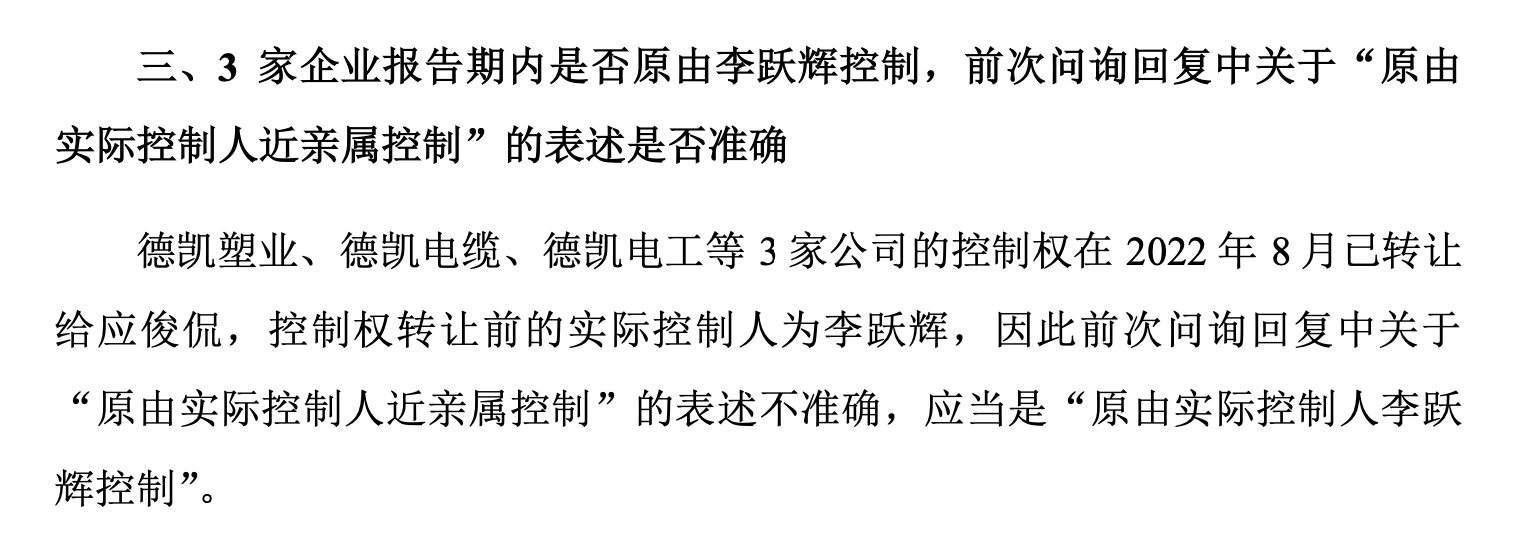 其次是德凯系三家企业的股权转让问题,在新三板的两轮问询回复中,公司对德凯电缆、德凯塑业、德凯电工三家关联企业控制权归属的披露存在不一致:首次问询回复仅表述为“原由实际控制人近亲属控制”,刻意回避了李跃辉作为实际控制人对三家企业的间接控制;直至二轮问询,公司才被迫更正为“原由实际控制人李跃辉控制”,承认此前表述不准确。