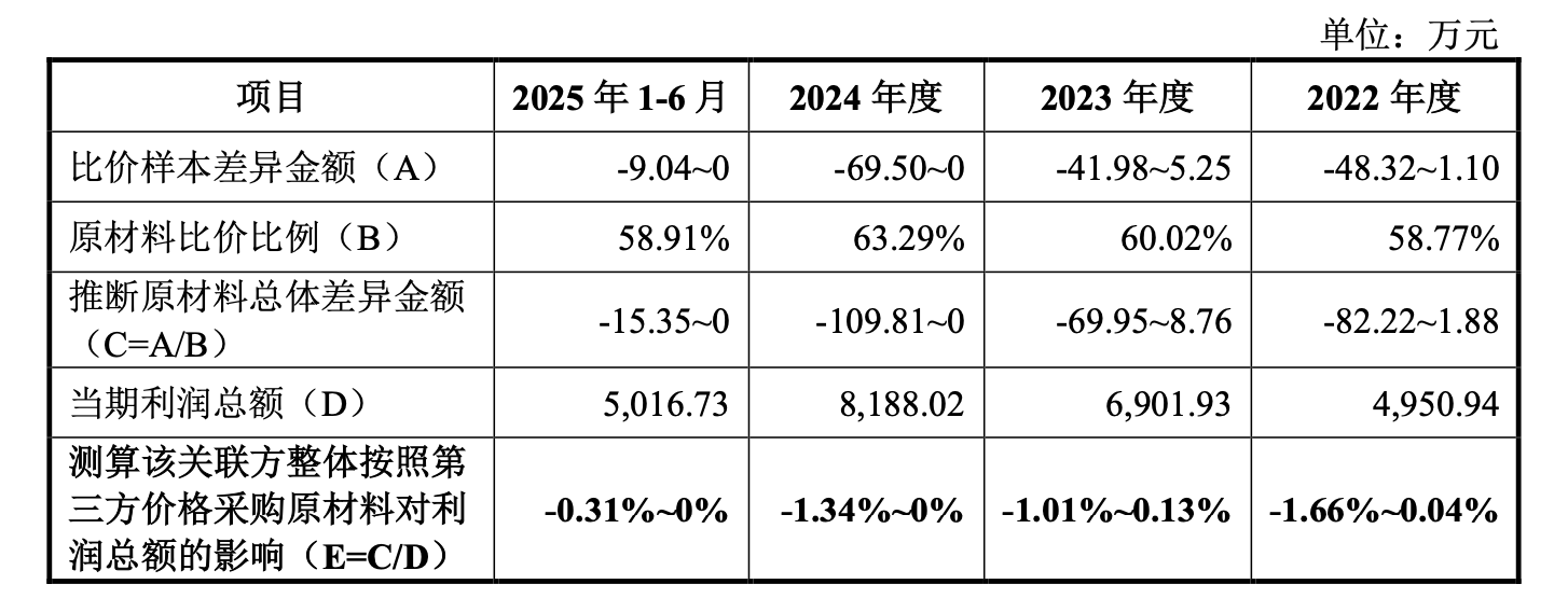 经过测算,2022年至2024年,德硕科技通过低价关联采购分别最多减少采购成本约82万元、70万元、110万元,分别影响当期利润的1.66%、1.01%和1.34%。