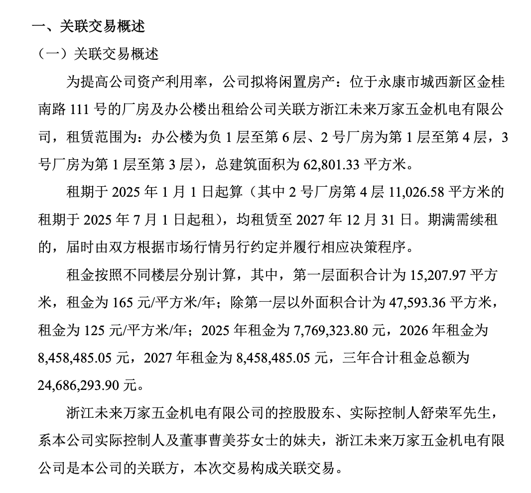 虽然报告期内,公司交流及锂电电动工具产品的产能利用率分别为95.73%、105.96%、120.60%和105.55%,基本处于满产甚至超产状态,但招股书显示,公司存在大量厂房闲置出租的情形,公司将位于永康市城西新区金桂南路111号的厂房和办公楼出租给关联方浙江未来万家。在现有产能已接近甚至超过上限的情况下,公司为何不优先利用这些闲置厂房进行扩产,反而一边将厂房出租给关联方赚取租金,一边向市场募资新建产能?