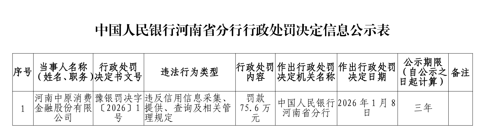 2026年1月8日,中国人民银行河南省分行再次对其开出75.6万元罚单,处罚原因是其违反信用信息采集、提供、查询及管理相关规定。