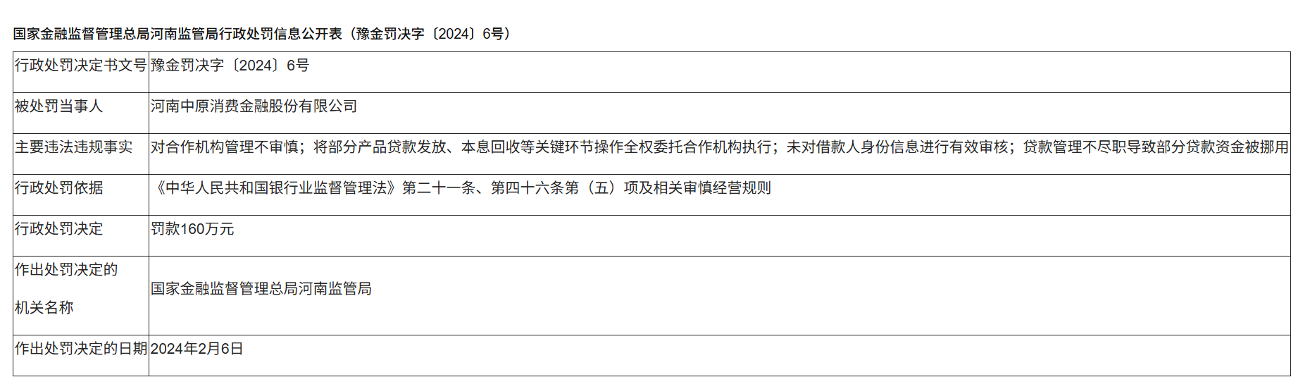 2024年2月6日,国家金融监督管理总局河南监管局对其处以160万元罚款,处罚理由直指核心:中原消金将贷款发放、本息回收等关键环节的操作全权委托给合作机构,且未有效审核借款人身份,存在明显的管理缺位。