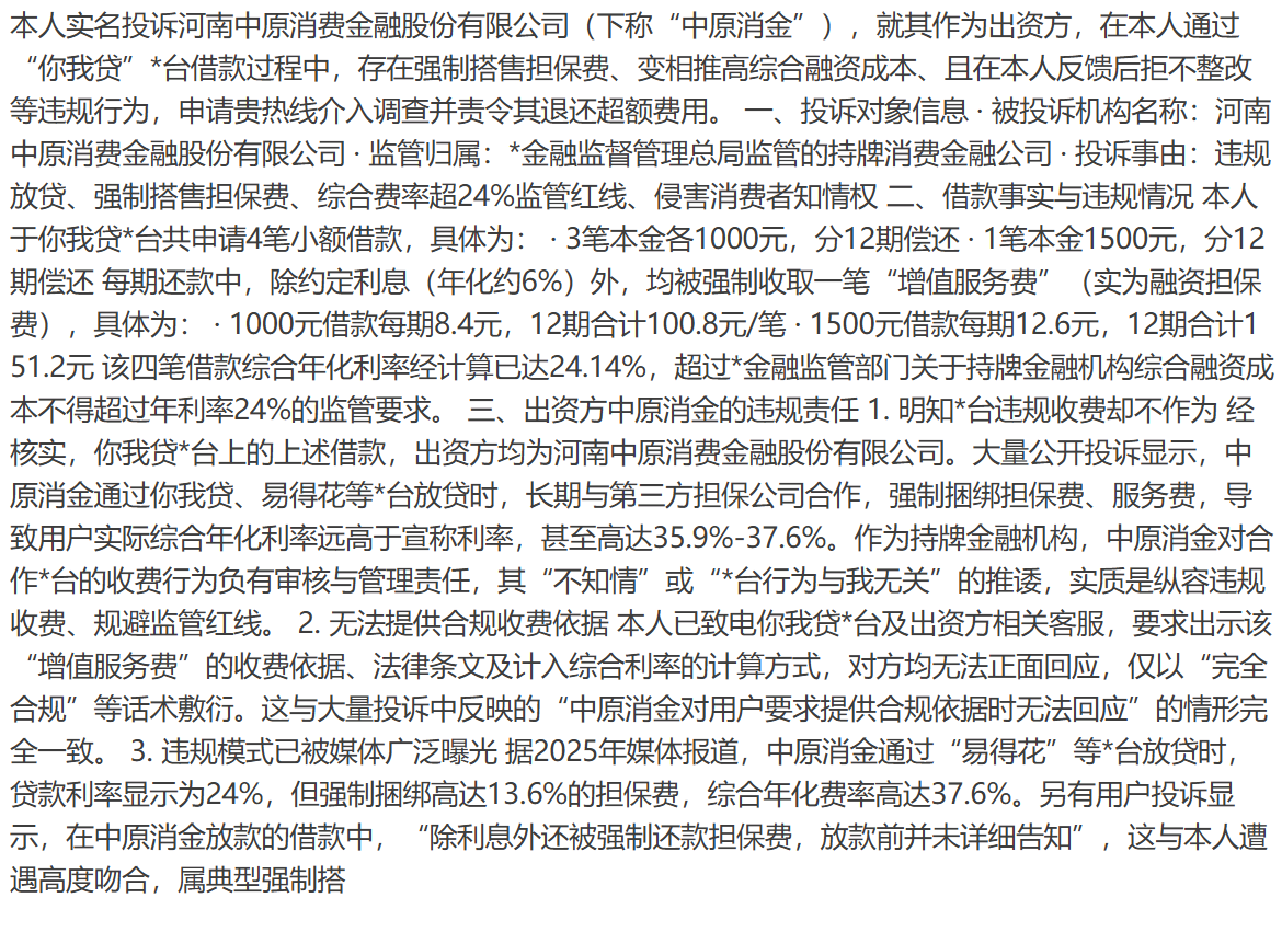 而除了催收问题,产品端息费结构的不透明,也是引发消费者投诉的另一大核心原因。中原消金通过哈啰臻有钱、易得花、得物等助贷平台分发的贷款产品,普遍存在“名义低息、实际高费”的现象。例如,在2025年的一起典型案例中,用户在贷款页面看到的年化利率仅为6%,但在强制搭售咨询费、担保费等相关费用后,综合年化利率瞬间飙升至37.97%,部分案例的年化费率甚至接近38%的监管红线。以一笔11000元的贷款本金为例,仅担保费一项就被扣除2462.16元。这种通过多层级拆分费用规避监管红线的做法,不仅侵犯了消费者的知情权,也让中原消金所宣称的“息费透明”难以落地。