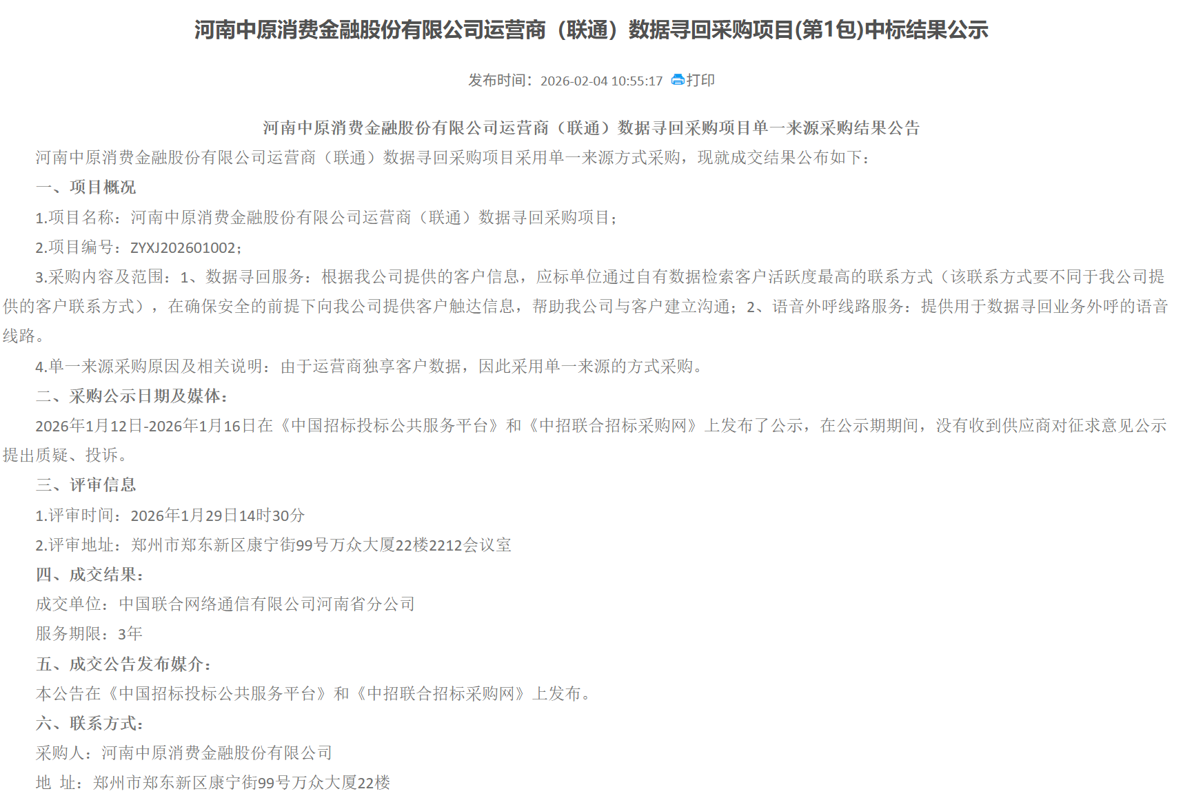这场围绕隐私保护与债权实现的深度博弈,始于2026年1月6日中原消金发布的“运营商数据寻回”单一来源采购公示。