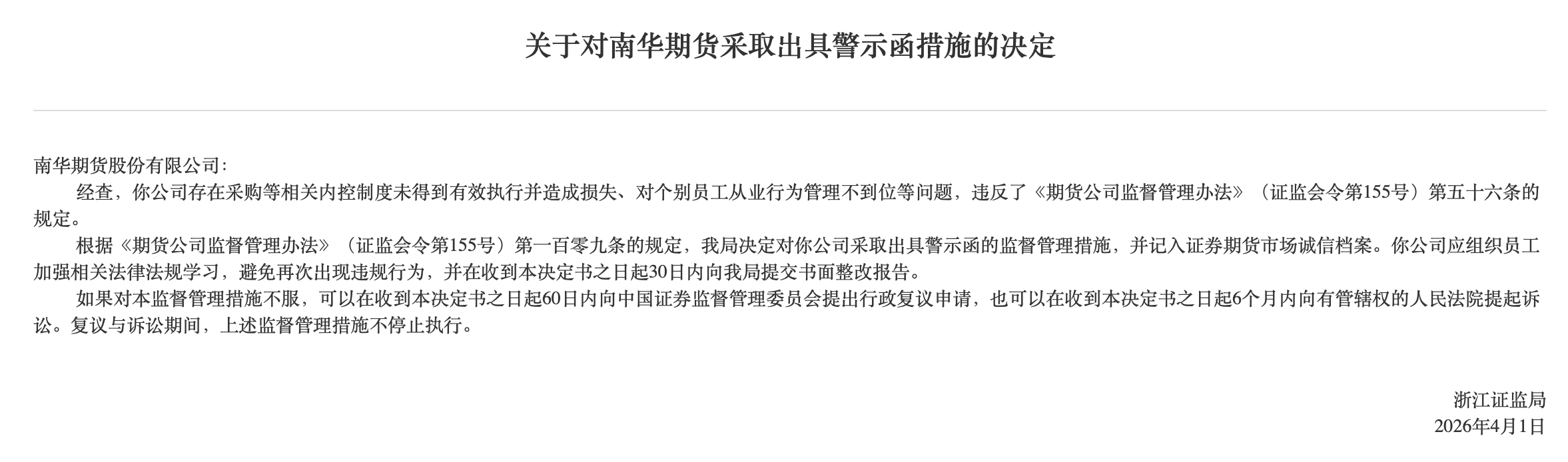 从2026年4月3日的警示函来看,浙江证监局指出南华期货存在采购等相关内控制度未得到有效执行并造成损失、对个别员工从业行为管理不到位等问题,贾晓龙作为公司总经理,对此负有管理责任,因此被一并出具警示函。