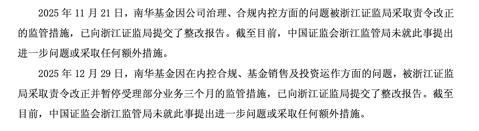 祸不单行的是,南华期货旗下的公募基金公司南华基金,也在2025年底连续被浙江证监局采取监管措施:2025年11月21日,因公司治理、合规内控问题被浙江证监局责令改正,相关高管被监管谈话或出具警示函;2025年12月29日,公司再因合规内控、投资运作、基金销售等问题被责令改正并暂停受理部分业务3个月。