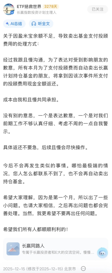 值得注意的是,这已非且慢首次因扣费问题引发争议。2025年12月,长赢指数投资计划主理人“ETF拯救世界”曾发文承诺,“今后不会再发生类似的事情。哪怕最极端的情况,也不会再自动卖持仓基金”。不到四个月,承诺便被打破。