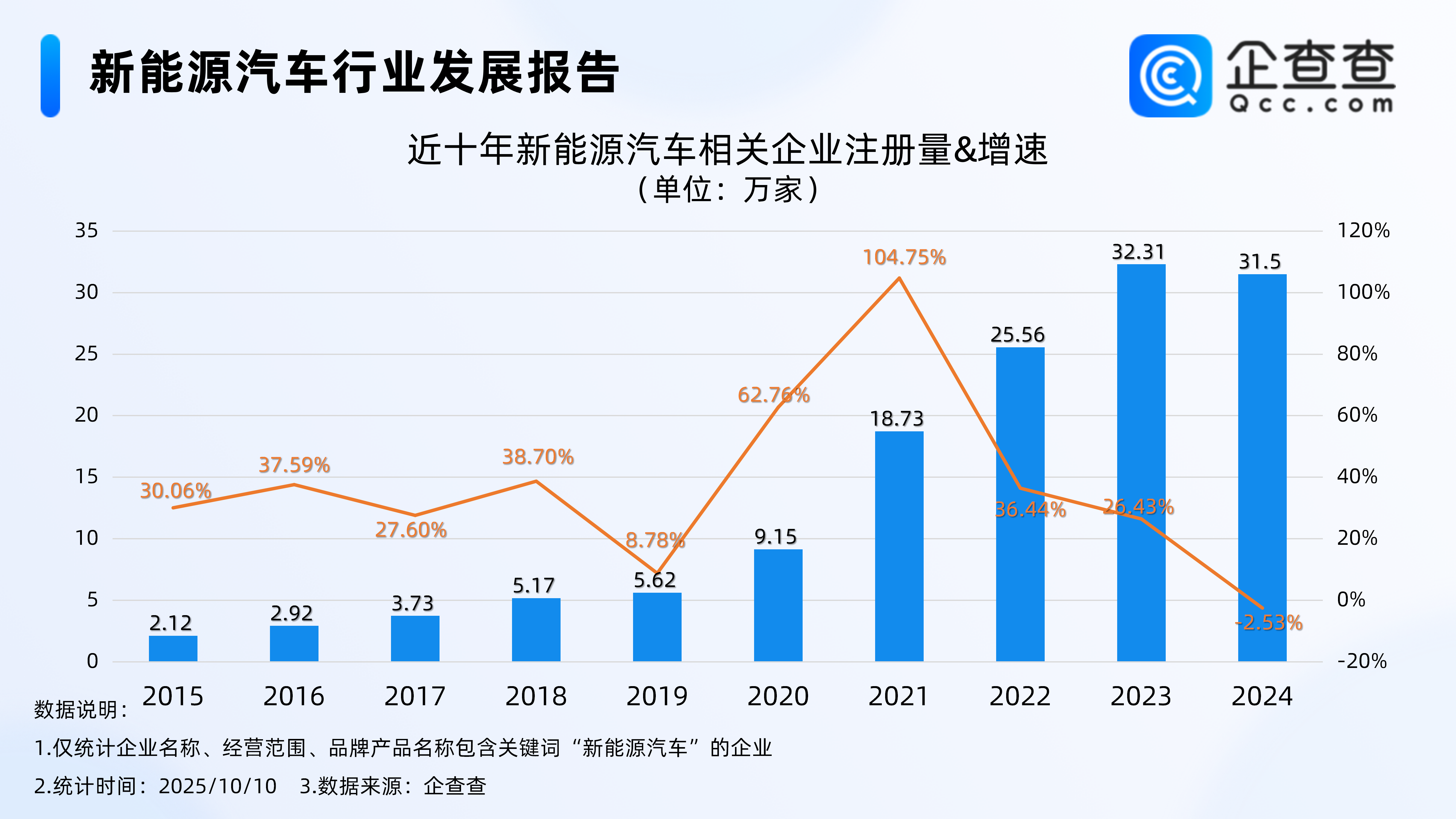 企查查数据显示,国内现存新能源汽车相关企业140.32万家。近十年相关企业注册量呈整体增长态势,2021年全年注册18.73万家相关企业,同比增长104.75%,达近十年注册量增速峰值。2023年全年注册量首次突破30万家,同比增长26.43%至32.31万家相关企业,达近十年注册量峰值。2024年全年注册31.5万家相关企业,虽较前一年有所下滑,但仍处于高位。截至目前,今年已注册24.68万家相关企业,其中前9月注册24.61万家,同比增长6.02%。
