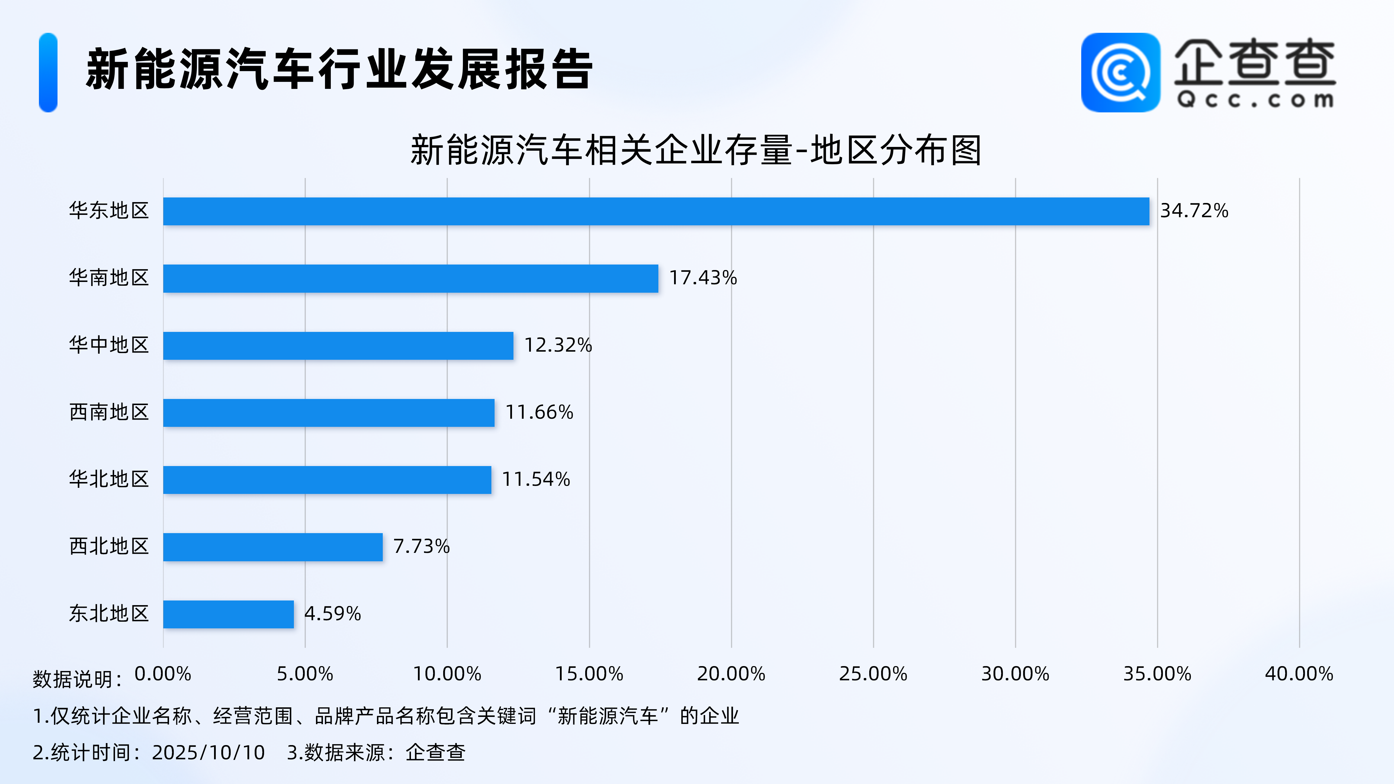 企查查数据显示,从地区分布来看,新能源汽车相关企业主要分布在华东地区,占比达34.72%。其次,分布在华南地区、华中地区、西南地区、华北地区的相关企业分别占比17.43%、12.32%、11.66%、11.54%。西北地区、东北地区相关企业存量占比均不足10%。