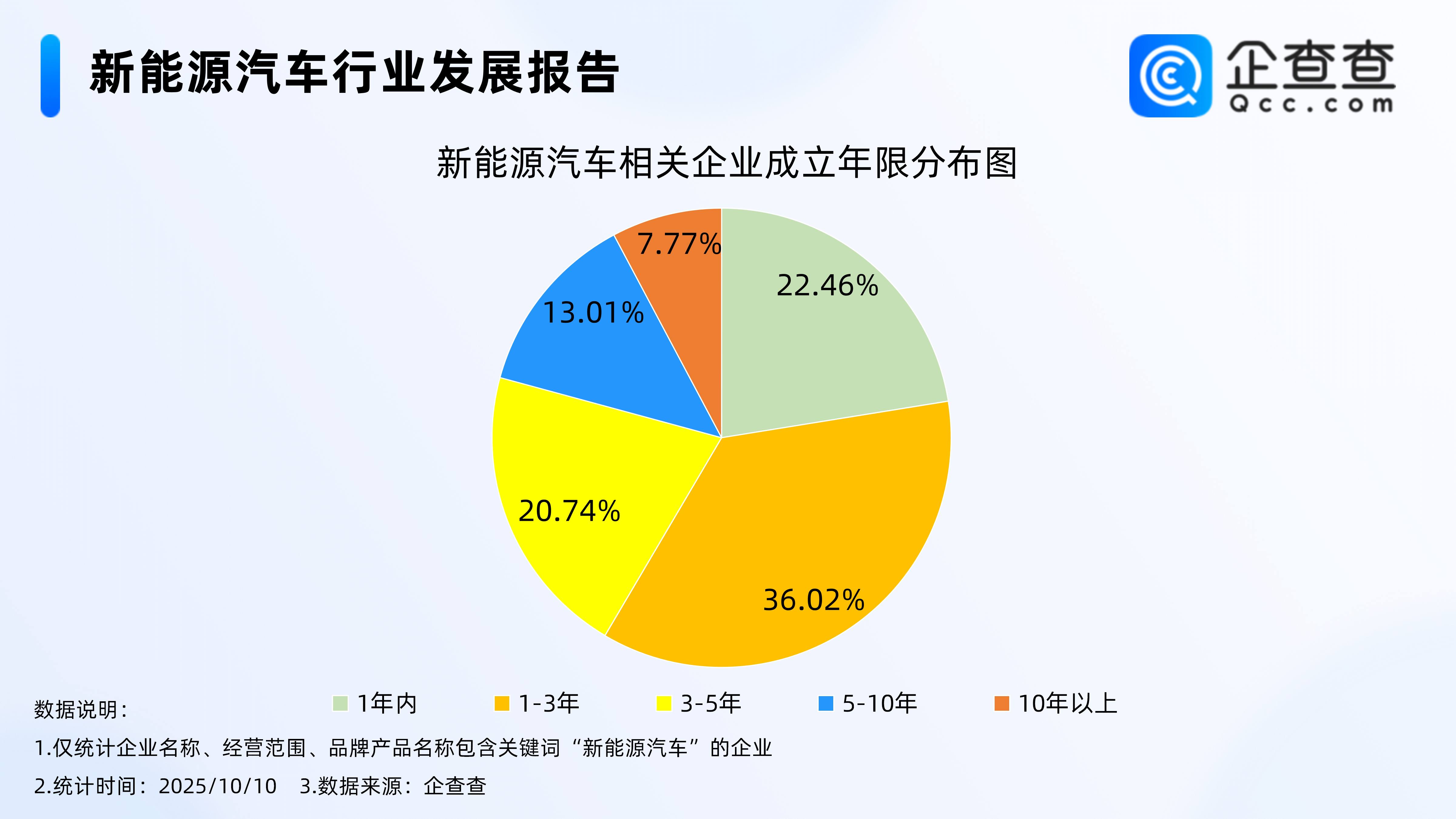 企查查数据显示,从经营时间来看,新能源汽车相关企业多成立于近三年,其中成立年限在1-3年的相关企业最多,占比36.02%。成立年限在1年内、3-5年的相关企业分别占比22.46%、20.74%。