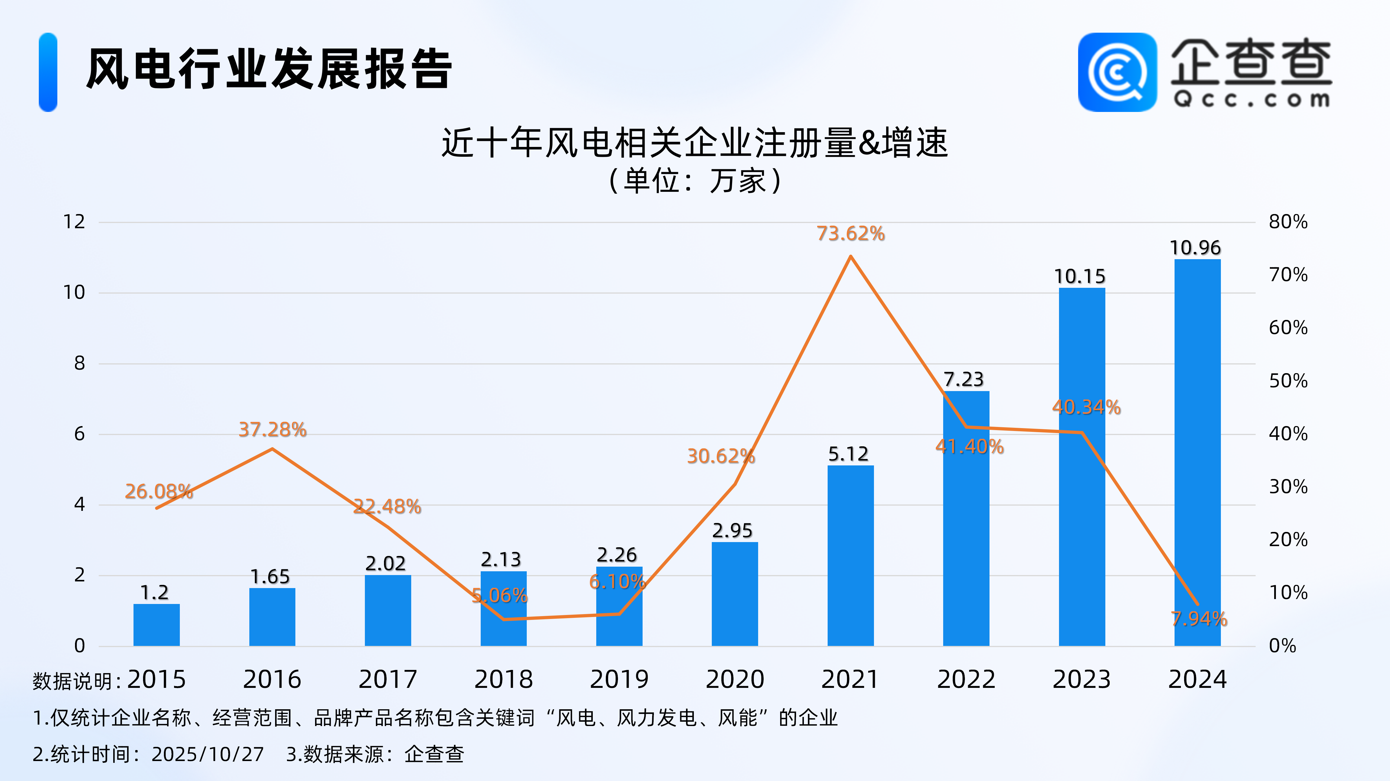 企查查数据显示,截至10月下旬,国内现存风电相关企业46.95万家。近十年风电相关企业注册量呈持续增长态势,其中2021年全年注册5.12万家相关企业,同比增长73.62%,达近十年注册量增速峰值。2024年全年注册10.96万家相关企业,同比增长7.94%,创近十年注册量新高。截至目前,今年已注册9.11万家,其中前9月注册8.57万家,同比增长8.95%。