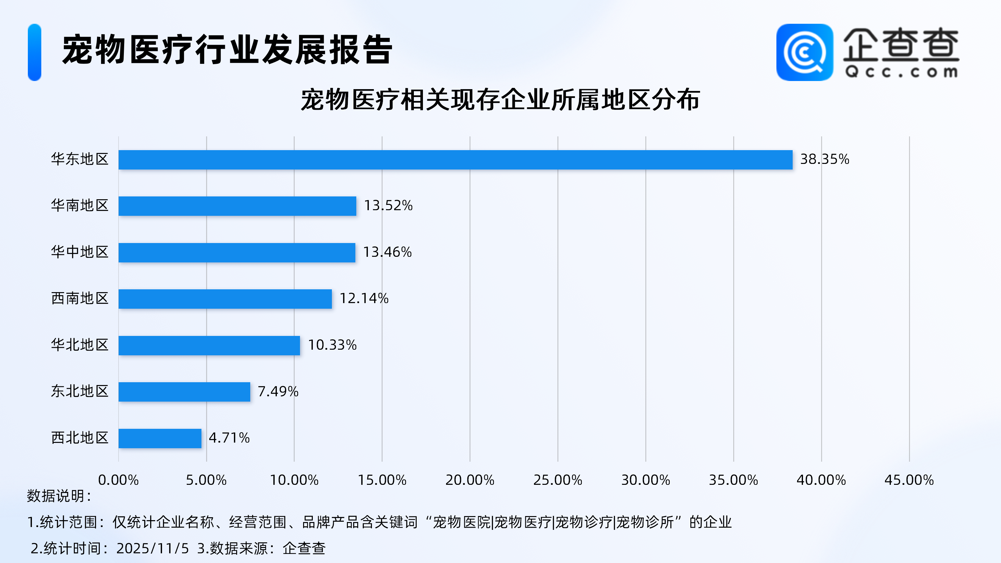 企查查数据显示,截至11月4日,国内宠物医疗相关现存企业达2.24万家,主要分布在华东地区,占比达38.35%。分布在华南地区、华中地区、西南地区、华北地区的相关企业,占比均在10%-15%之间,其中华南地区、华中地区占比相近,分别达13.52%、13.46%。