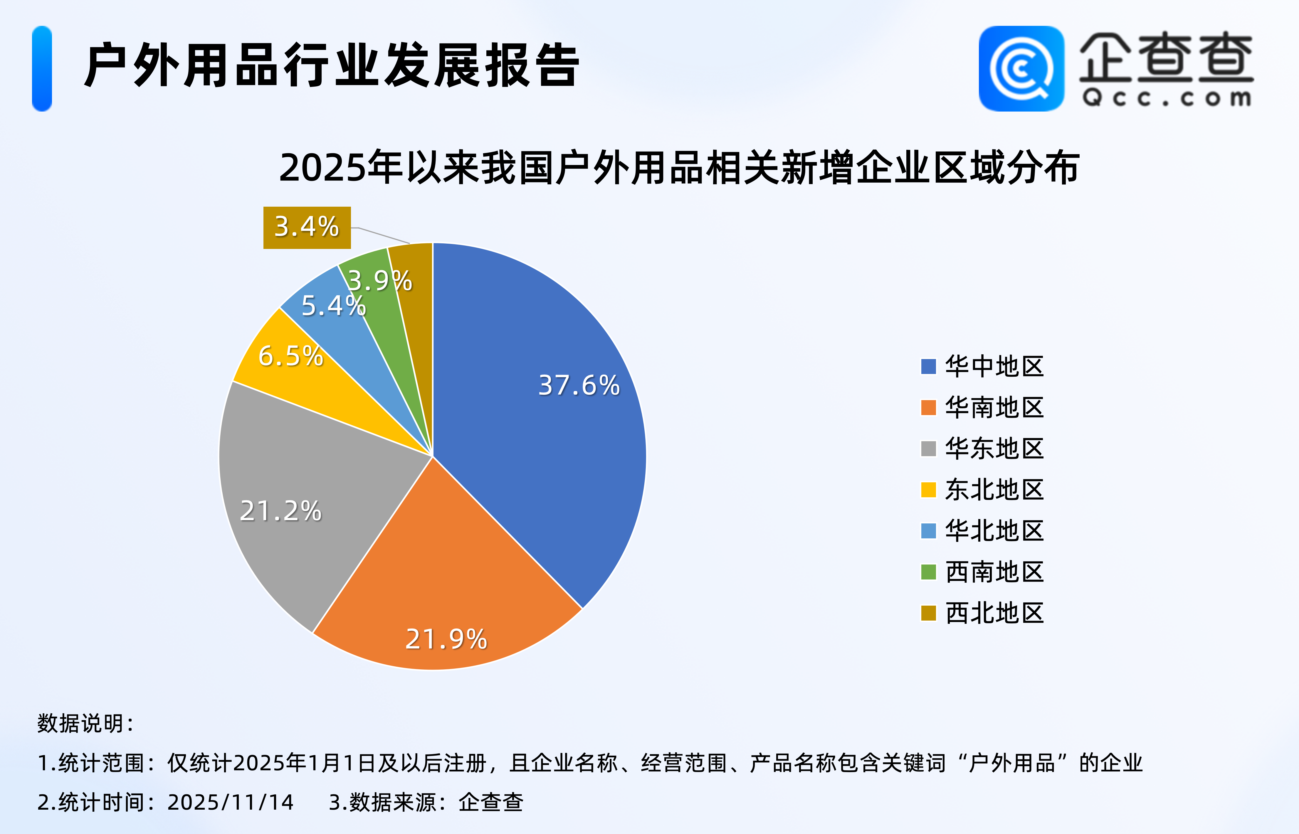 企查查数据显示,今年新注册的户外用品相关企业中,分布在华中地区的最多,占比37.6%,其次是华南、华东地区,分占21.9%、21.2%,西南、西北地区相对较少,分占3.9%、3.4%。