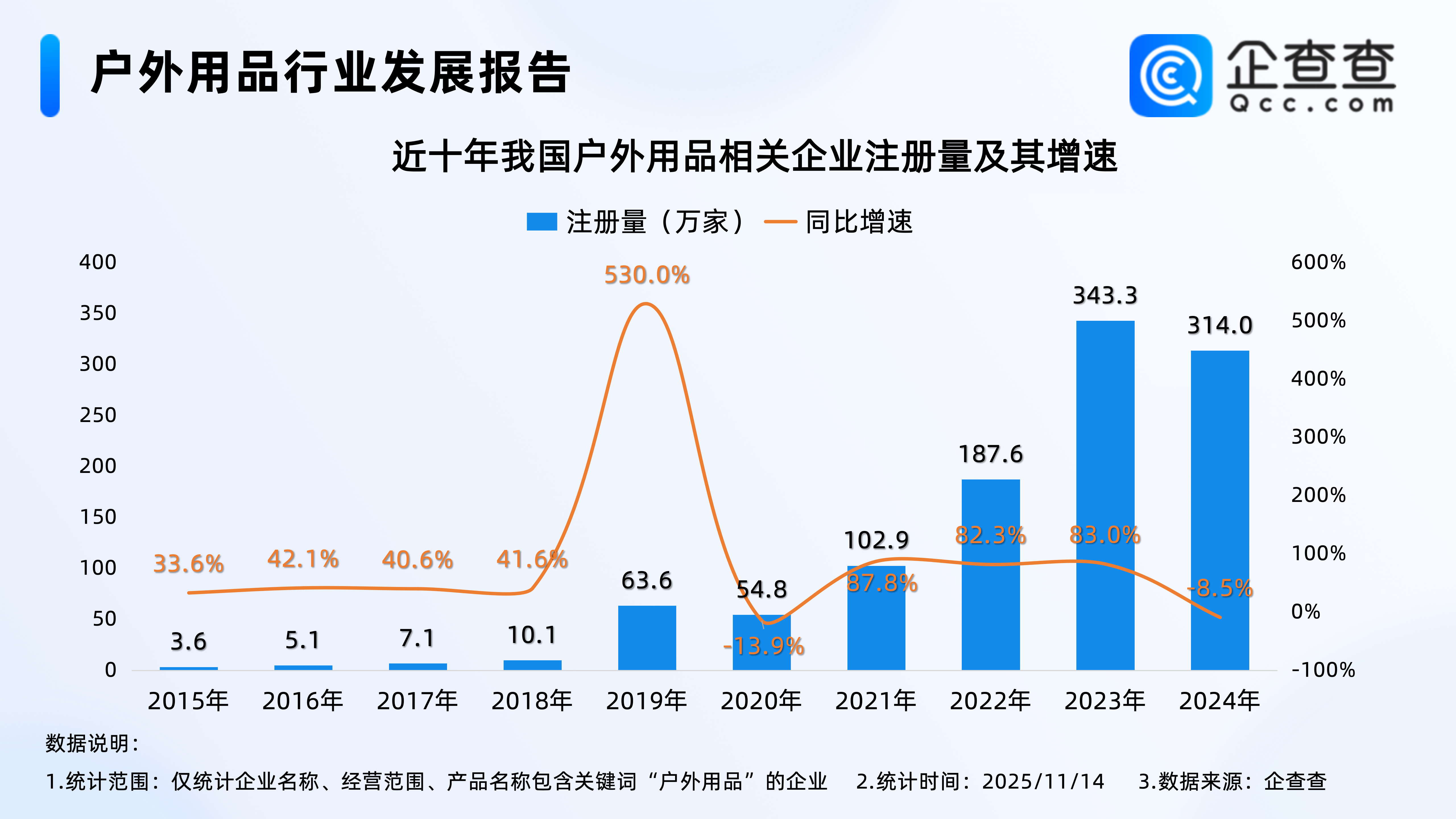 企查查数据显示,2019年,我国户外用品相关企业注册量激增,全年注册63.6万家相关企业,是2018年全年注册量的6倍有余;2023年全年,我国累计注册343.3万家户外用品相关企业,同比增加83.0%,注册量达近十年峰值;截至11月14日,2025年我国已注册269.3万家户外用品相关企业。