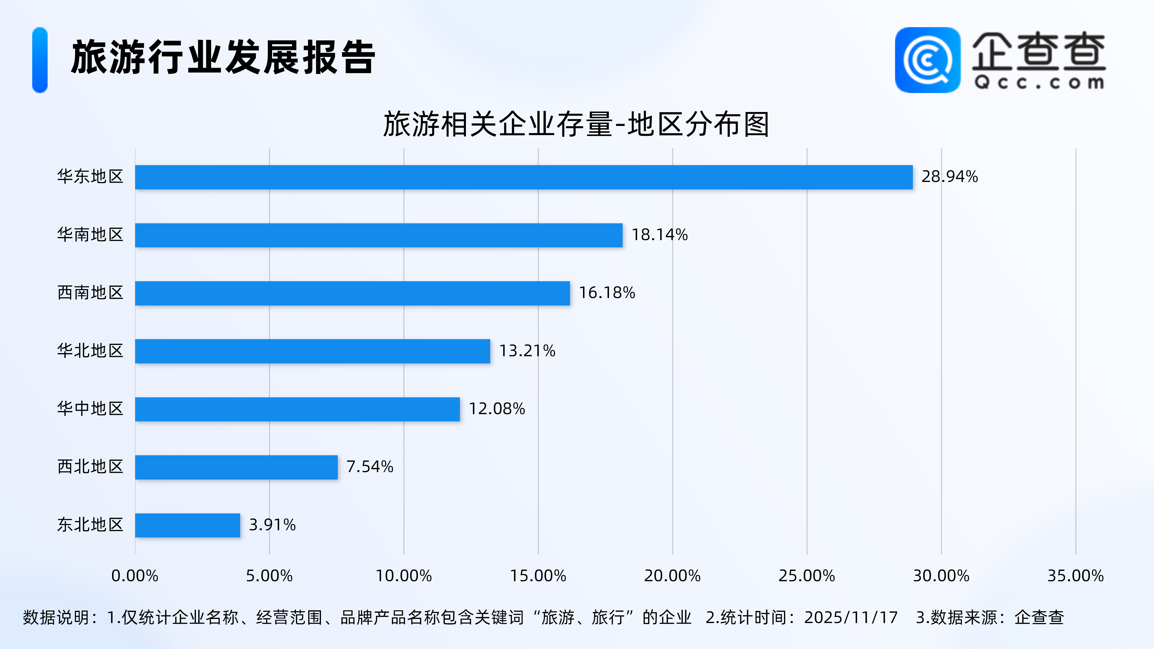 企查查数据显示,从地区分布来看,旅游相关企业主要集中分布在华东地区,占比28.94%。其次,分布在华南地区、西南地区的旅游相关企业分别占比18.14%、16.18%。