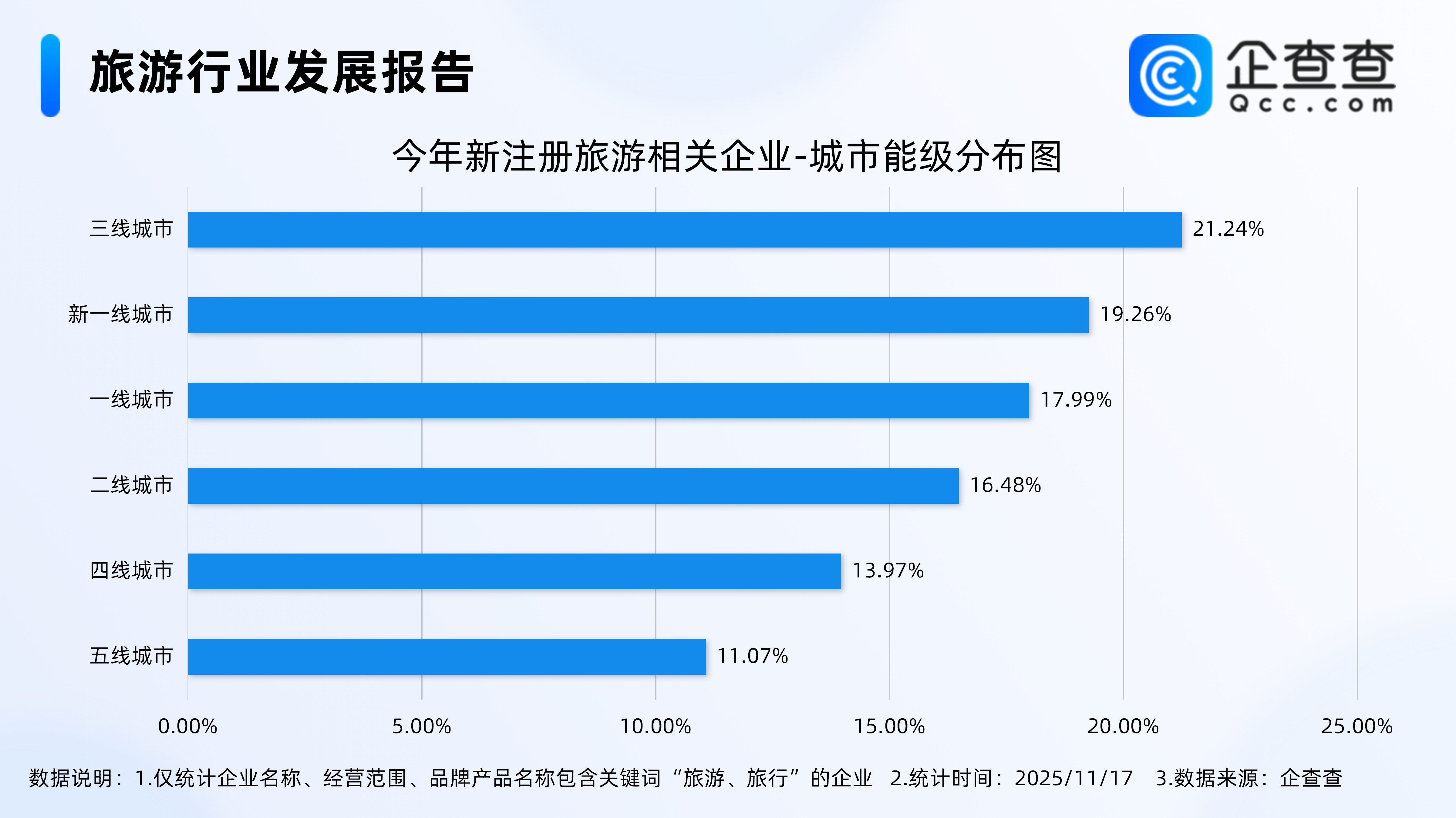 企查查数据显示,注册量方面,近十年旅游相关企业注册量呈整体增长态势,2024年全年注册相关企业31.82万家,截至目前,今年已注册27.63万家。从城市能级分布来看,今年新注册旅游相关企业多分布在三线城市,占比21.24%。其次,新一线城市、一线城市的相关企业注册贡献率分别为19.26%、17.99%。