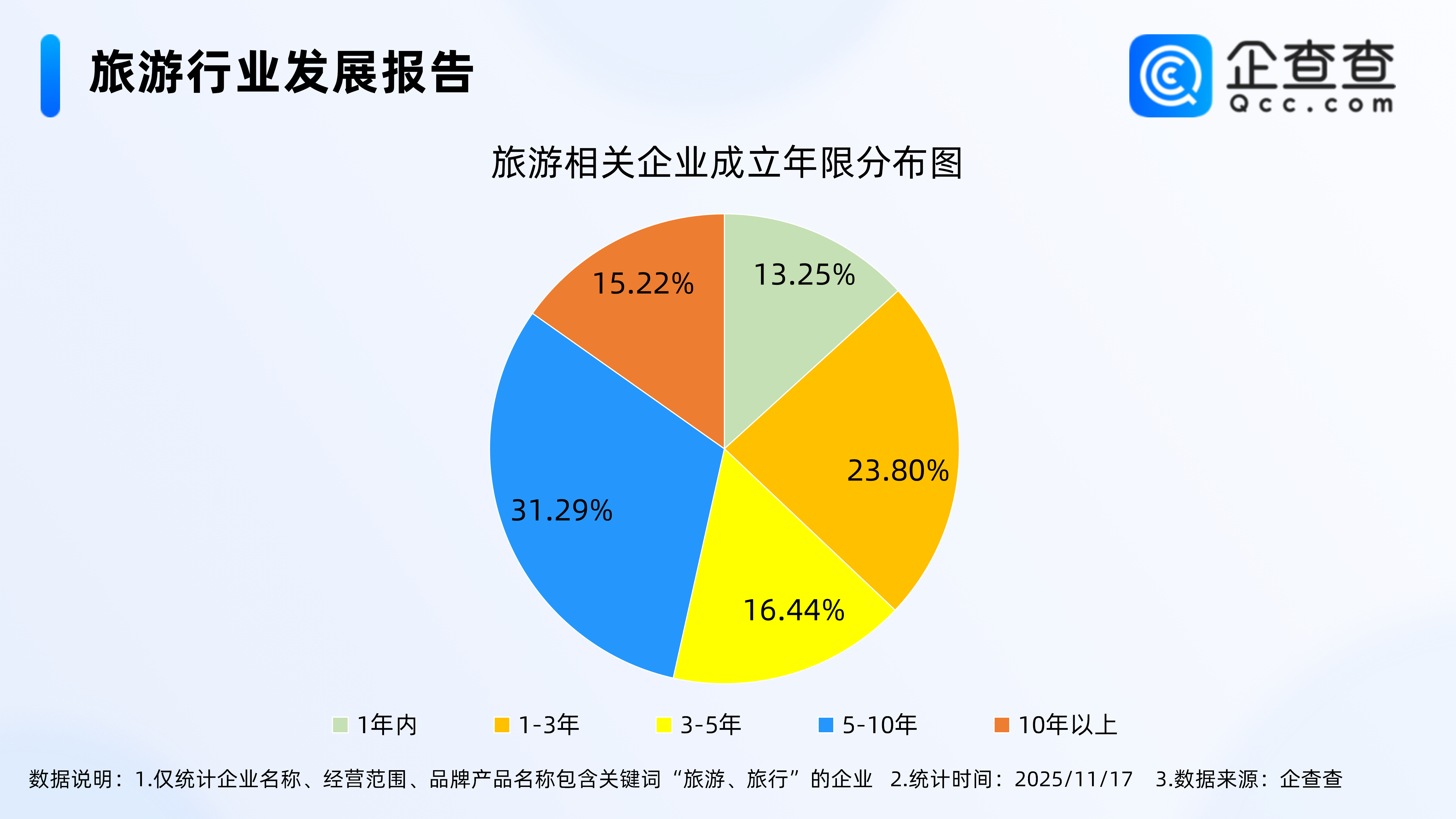 企查查数据显示,截至11月17日,国内现存旅游相关企业232.73万家。从经营时间来看,成立年限在5-10年的旅游相关企业最多,占比31.29%。其次,成立年限在1-3年、3-5年的相关企业分别占比23.80%、16.44%。