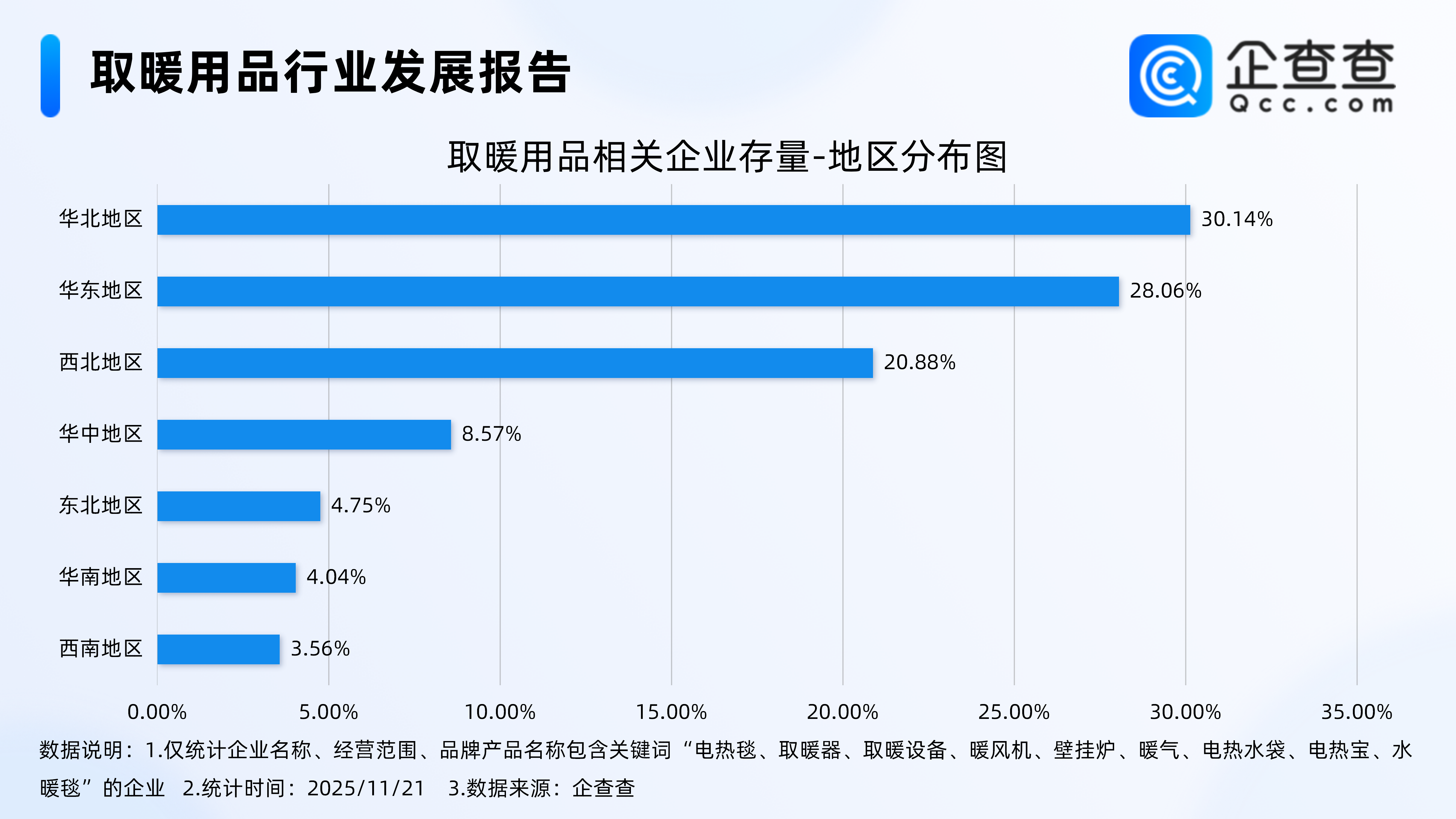 企查查数据显示,从地区分布来看,取暖用品相关企业主要分布在华北地区、华东地区和西北地区,分别占比30.14%、28.06%、20.88%。其他地区占比均不足10%。