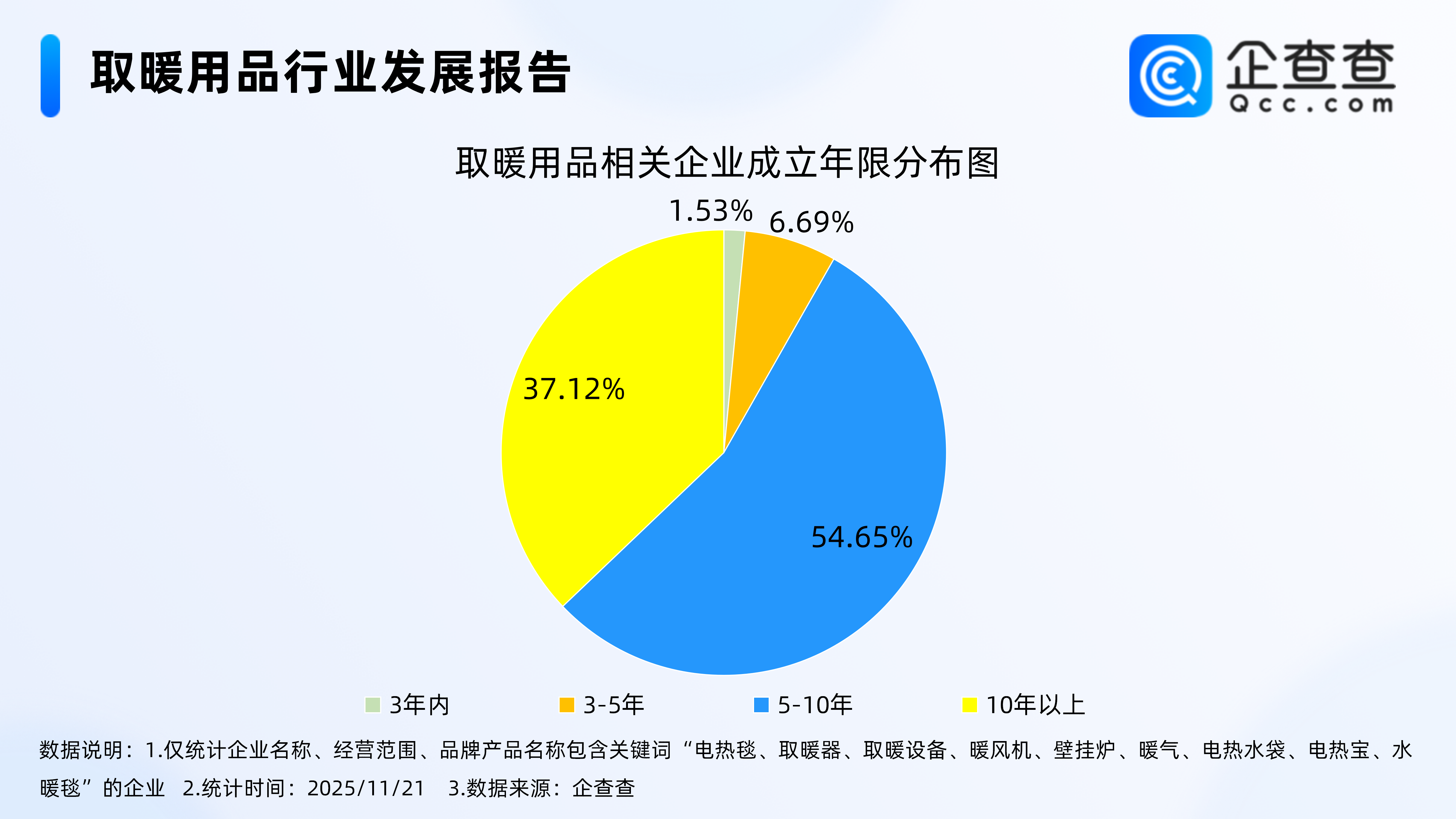 企查查数据显示,截至11月21日,国内现存取暖用品相关企业4.95万家。从经营时间来看,取暖用品相关企业多为老牌企业,成立年限在5-10年的相关企业占比过半,达54.65%。其次,成立年限在10年以上的相关企业占比37.12%。