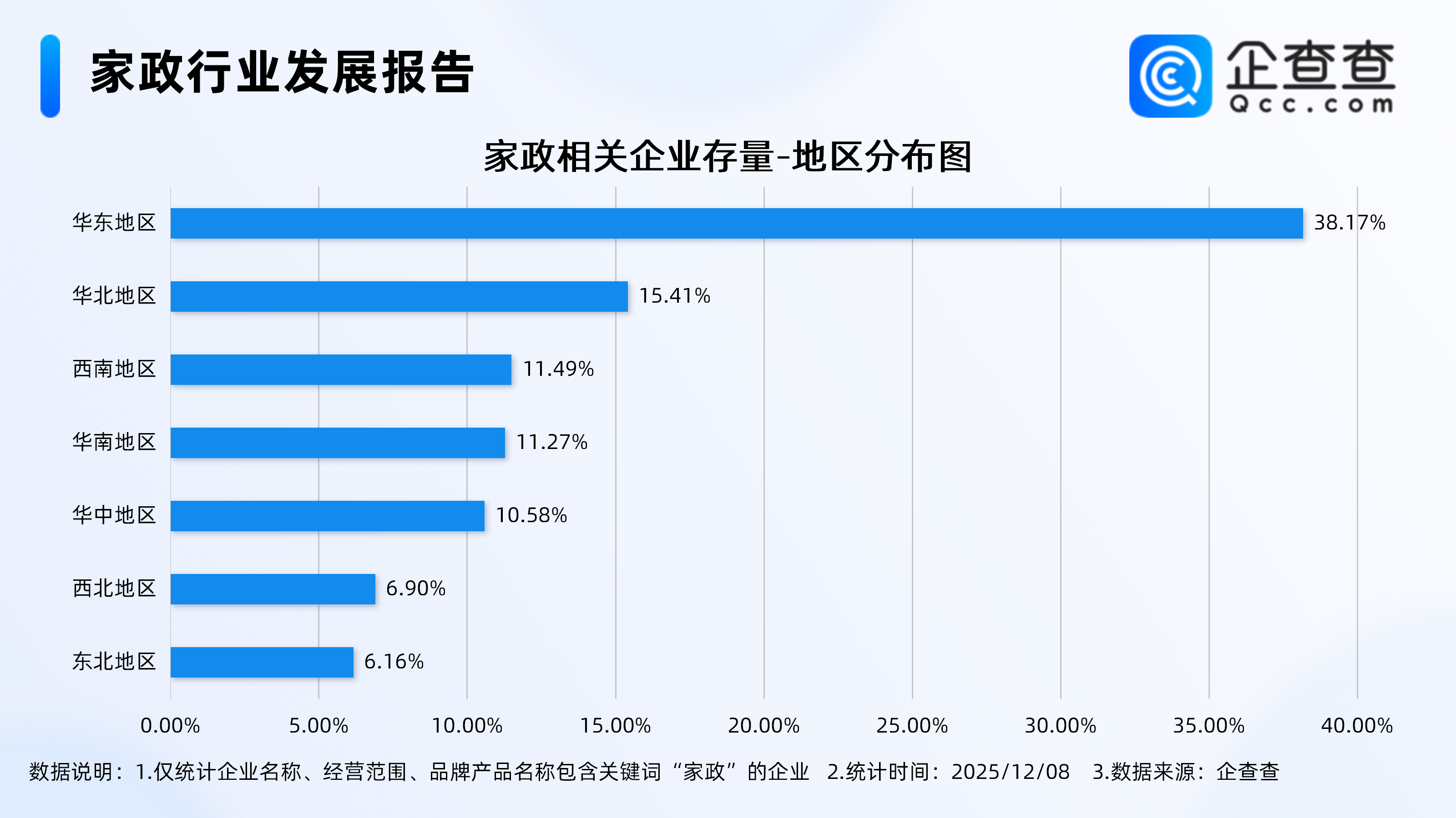 企查查数据显示,从地区分布来看,现存家政相关企业主要集中分布在华东地区,占比达38.17%。其次,分布在华北地区、西南地区的家政相关企业分别占比15.41%、11.49%。