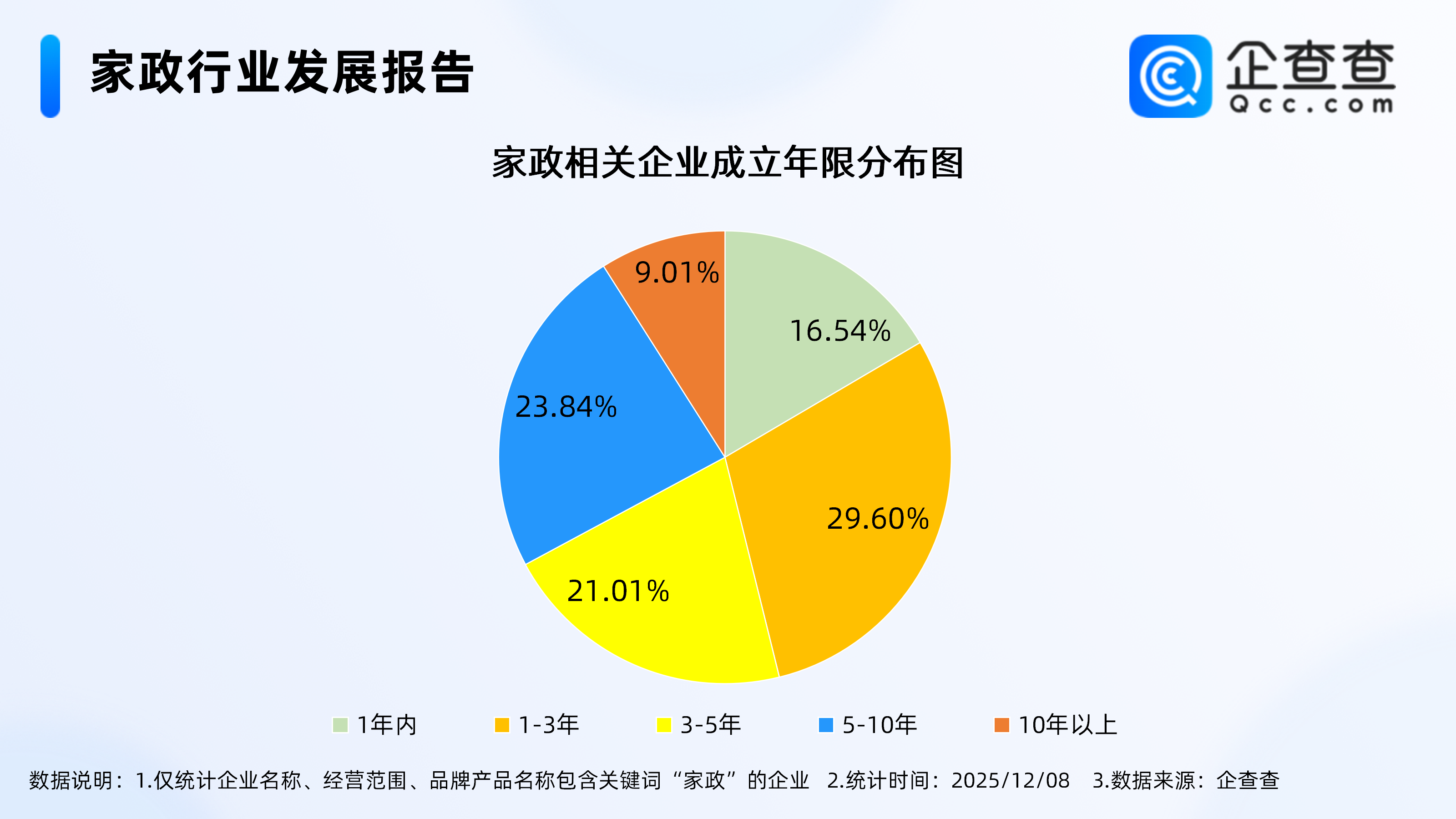 企查查数据显示,截至12月8日,国内现存家政相关企业291.05万家。近十年相关企业注册量呈上下波动态势,2024年全年注册54.55万家相关企业。截至目前,今年已注册46.86万家相关企业。从经营时间来看,近半数现存家政相关企业成立于近三年,其中,成立年限在1-3年的相关企业最多,占比29.60%。成立年限在1年内的相关企业占比16.54%。