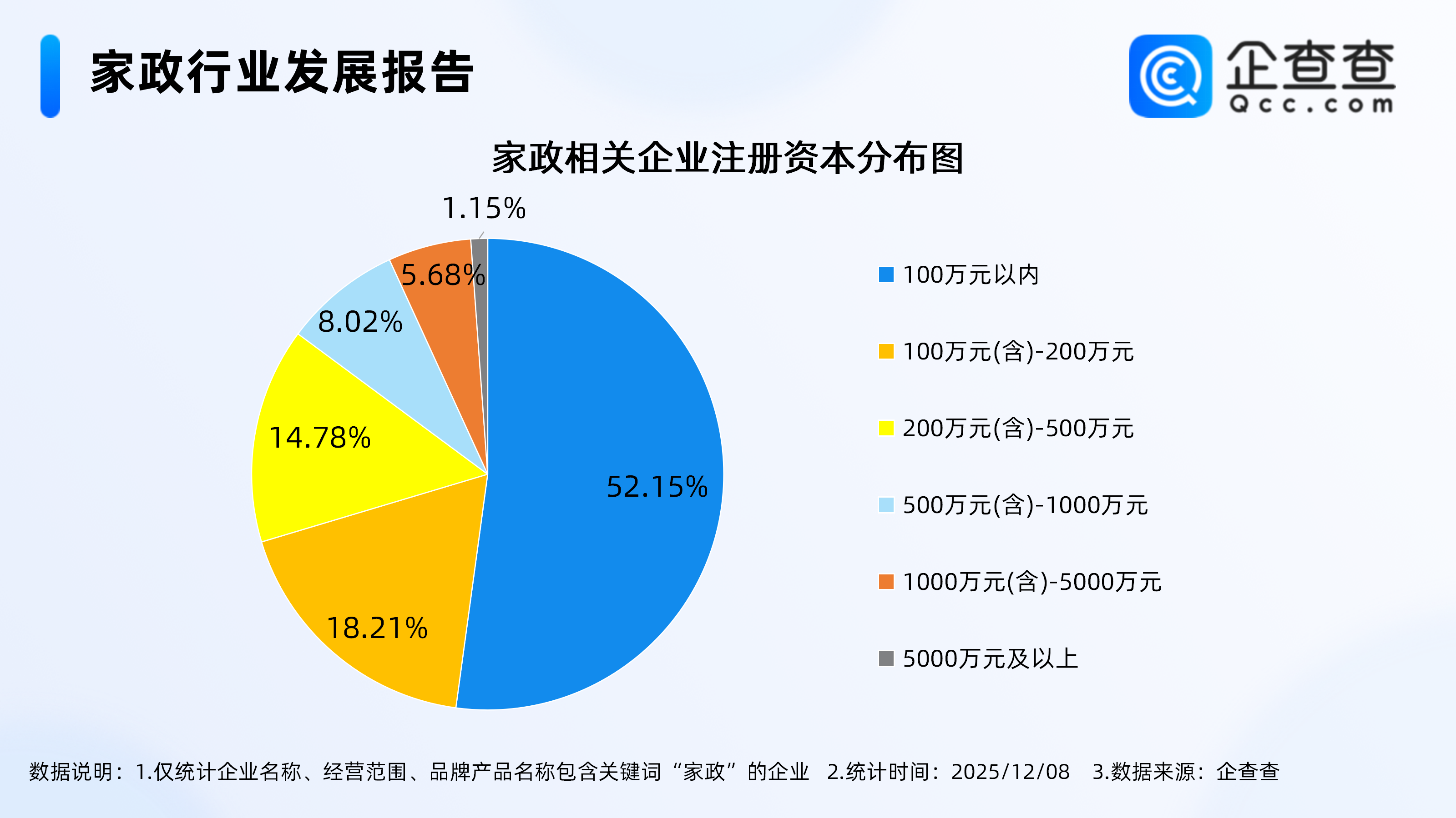 企查查数据显示,从注册资本来看,超半数家政相关企业的注册资本在100万元以内,占比达52.15%。其次,注册资本在100万元(含)-200万元、200万元(含)-500万元的家政相关企业分别占比18.21%、14.78%。