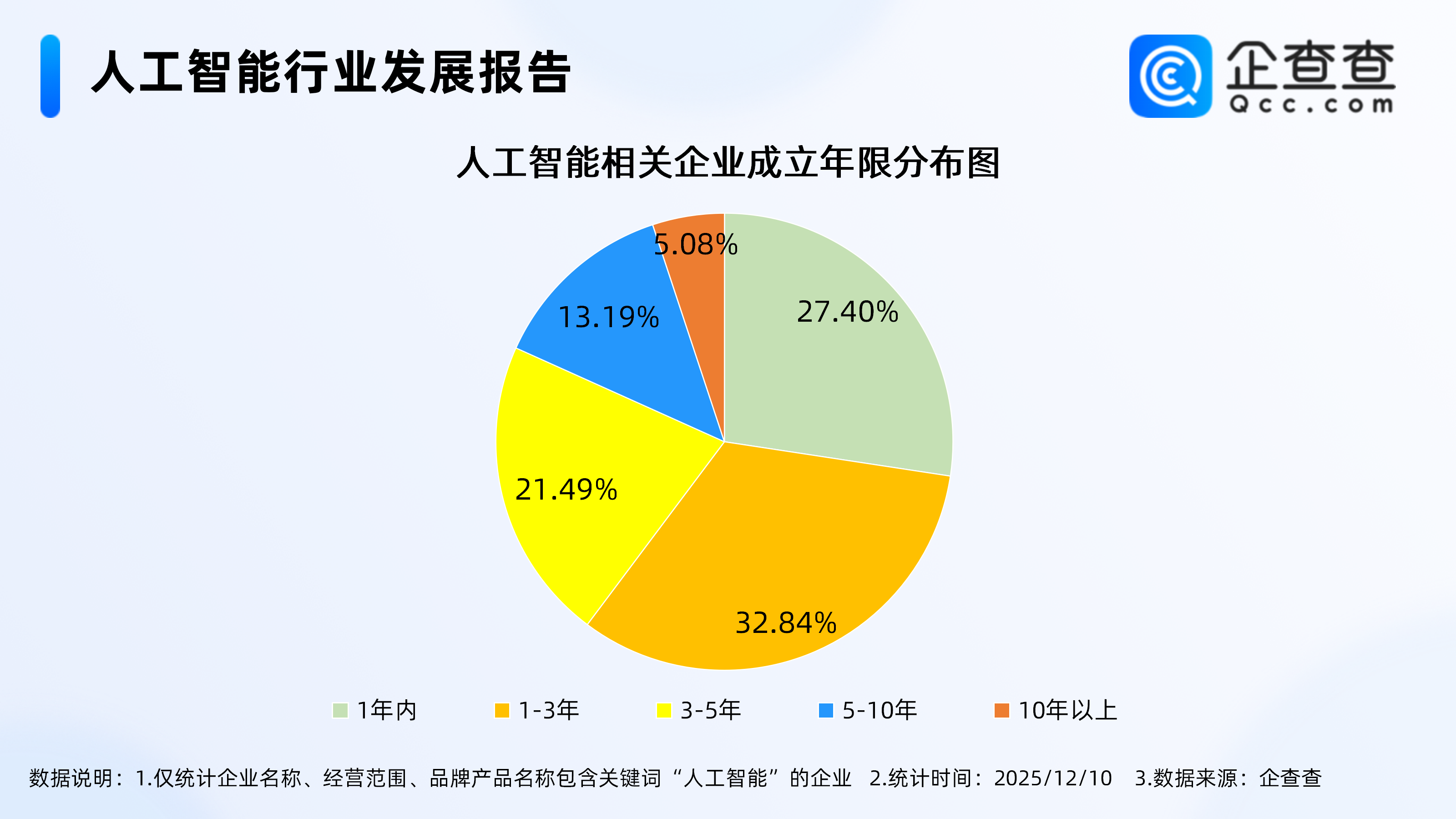 企查查数据显示,截至12月10日,国内现存人工智能相关企业257.87万家。从经营时间来看,超六成人工智能相关企业成立于近三年,其中成立年限在1-3年的相关企业最多,占比32.84%,成立年限在1年内的相关企业占比27.40%。成立年限在10年以上的相关企业占比仅5.08%。