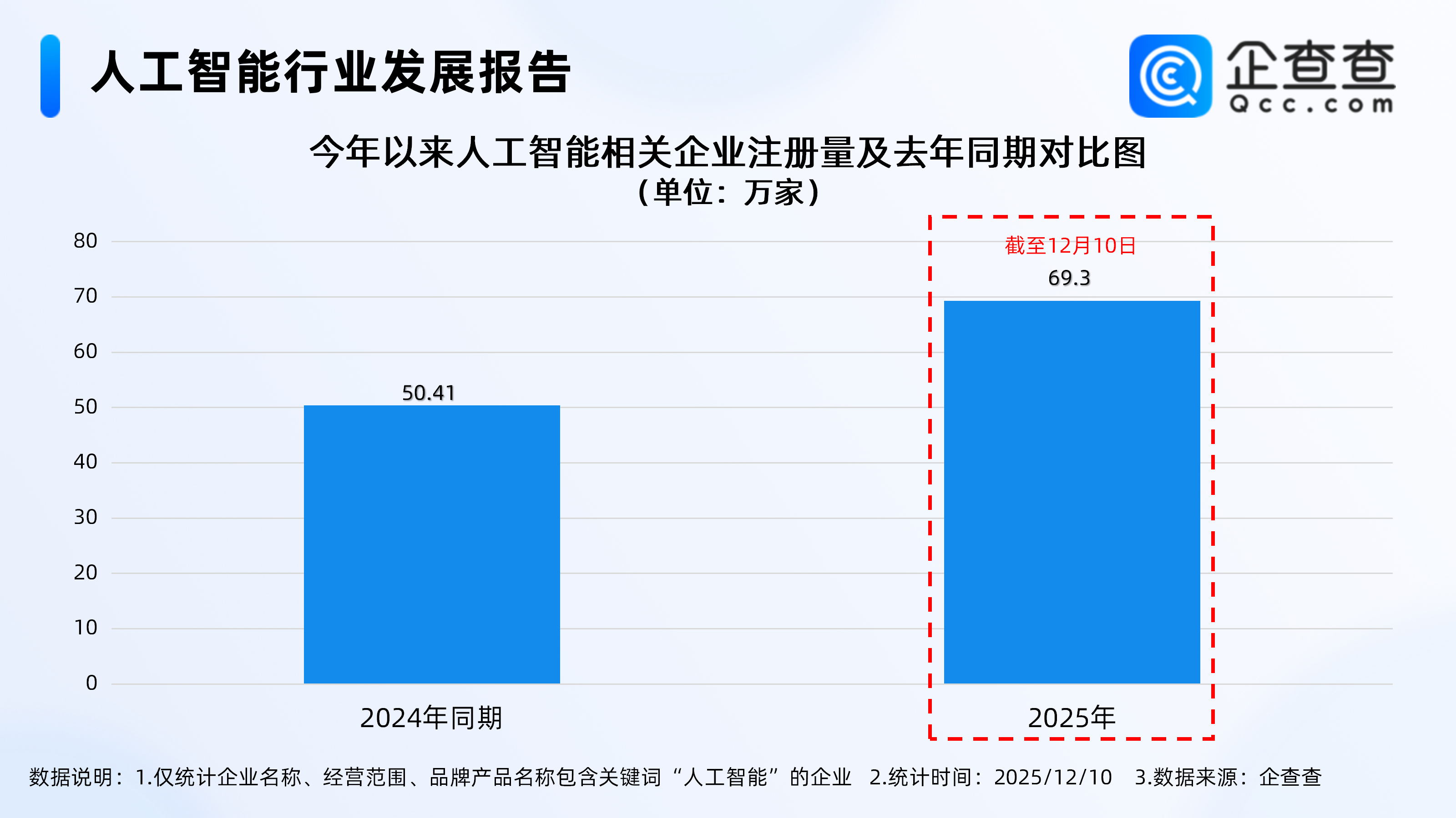 企查查数据显示,近十年人工智能相关企业呈整体增长态势,2023年注册量首次突破50万家,同比增长24.12%至54.97万家,达近十年注册量峰值。2024年全年注册54.45万家相关企业,虽较前一年略有所下滑,但仍处于高位。截至12月10日,今年已注册69.3万家人工智能相关企业,较去年同期增长37.47%。