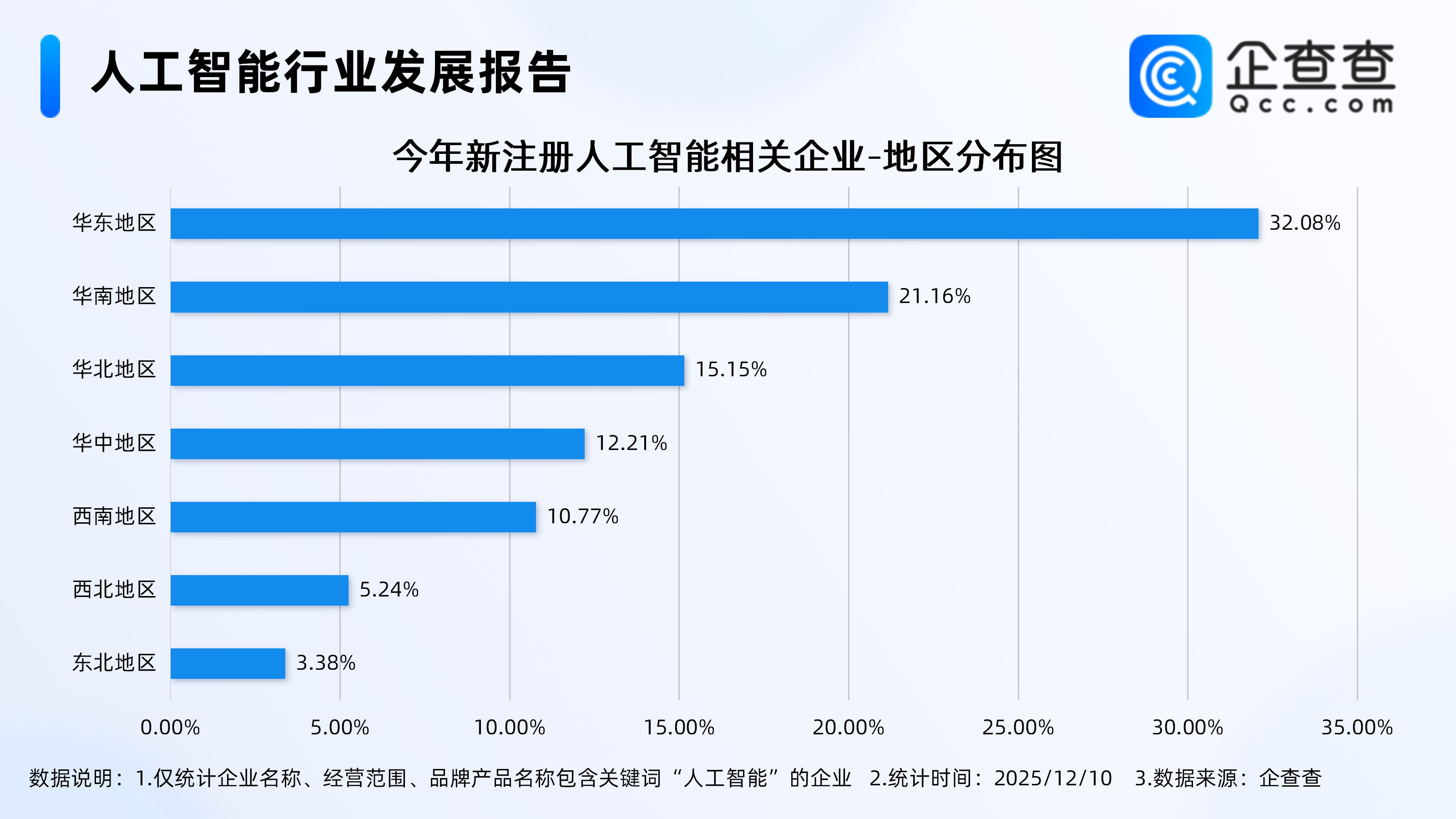 企查查数据显示,从地区分布来看,今年新注册的人工智能相关企业多分布在华东地区,占比达32.08%。其次,华南地区、华北地区今年相关企业注册贡献率分别为21.16%、15.15%。