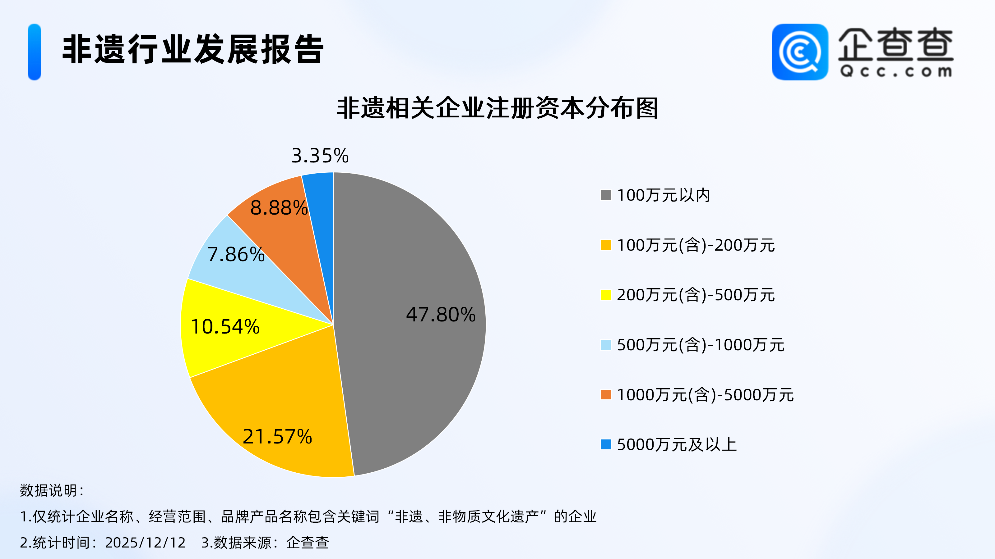 企查查数据显示,从注册资本来看,非遗相关现存企业多为轻量级企业,注册资本在100万元以内的相关企业占比近半,达47.80%。其次,注册资本在100万元(含)-200万元的相关企业占比21.57%。注册资本在千万级以上的相关企业共计占比12.22%。