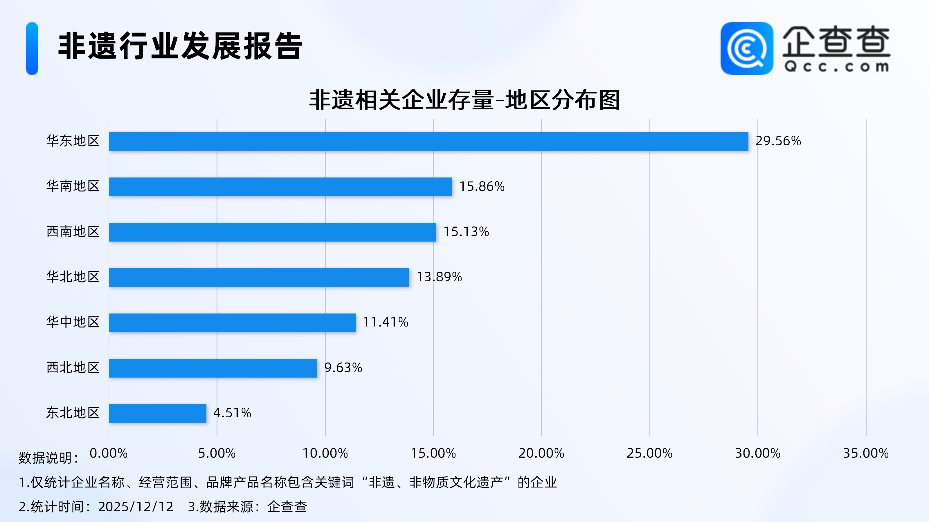 企查查数据显示,从地区分布来看,非遗相关现存企业主要分布在华东地区,占比29.56%。其次,分布在华南地区、西南地区的非遗相关企业分别占比15.86%、15.13%。