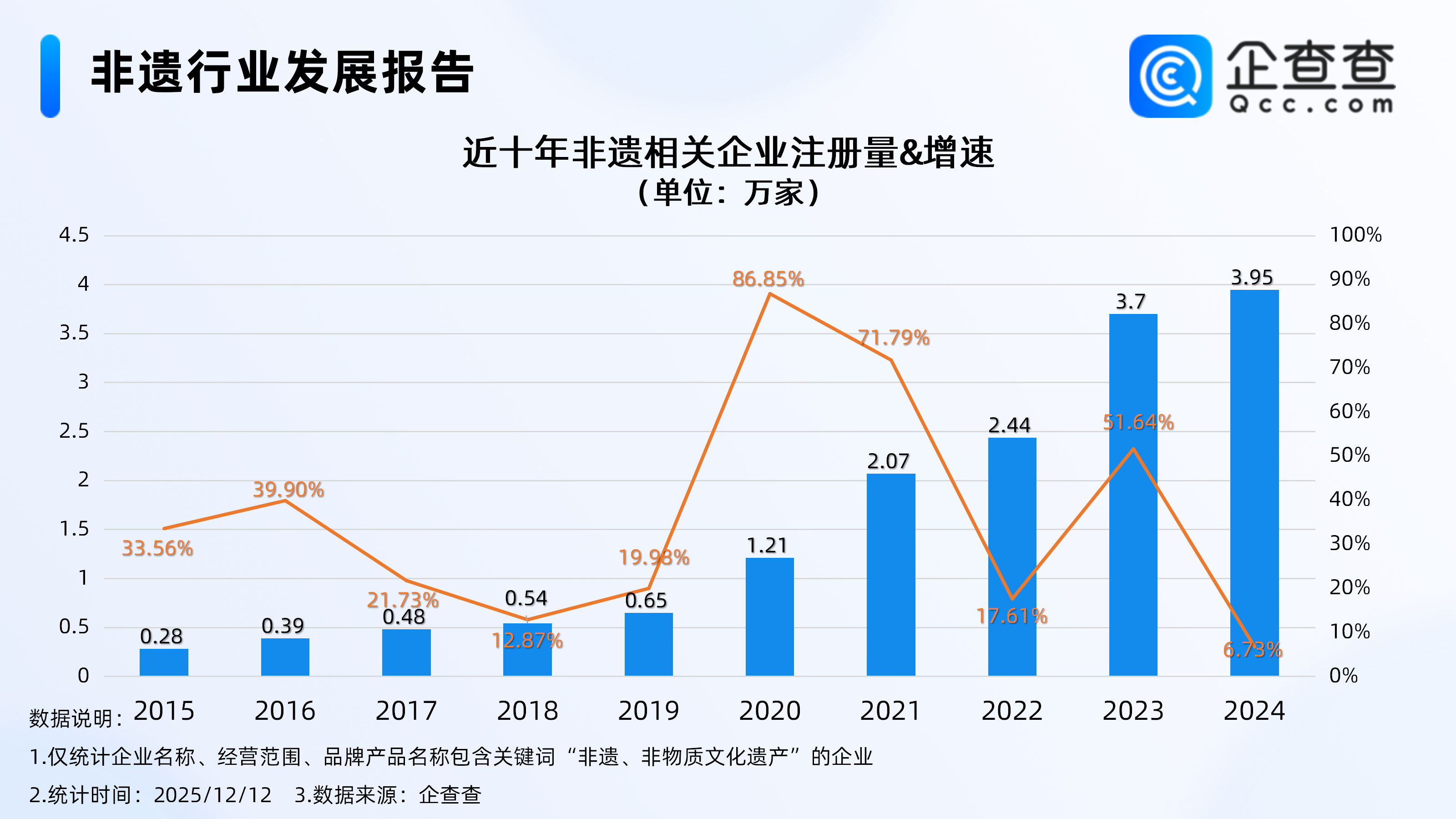企查查数据显示,截至12月12日,国内现存非遗相关企业17.83万家。近十年非遗相关企业注册量呈持续增长态势,2020年全年注册1.21万家相关企业,同比增长86.85%,达近十年注册增速峰值。2024年全年注册3.95万家非遗相关企业,同比增长6.73%。截至目前,今年已注册4.47万家非遗相关企业,远超去年全年注册水平,其中前11月注册4.31万家,同比增长21.45%。