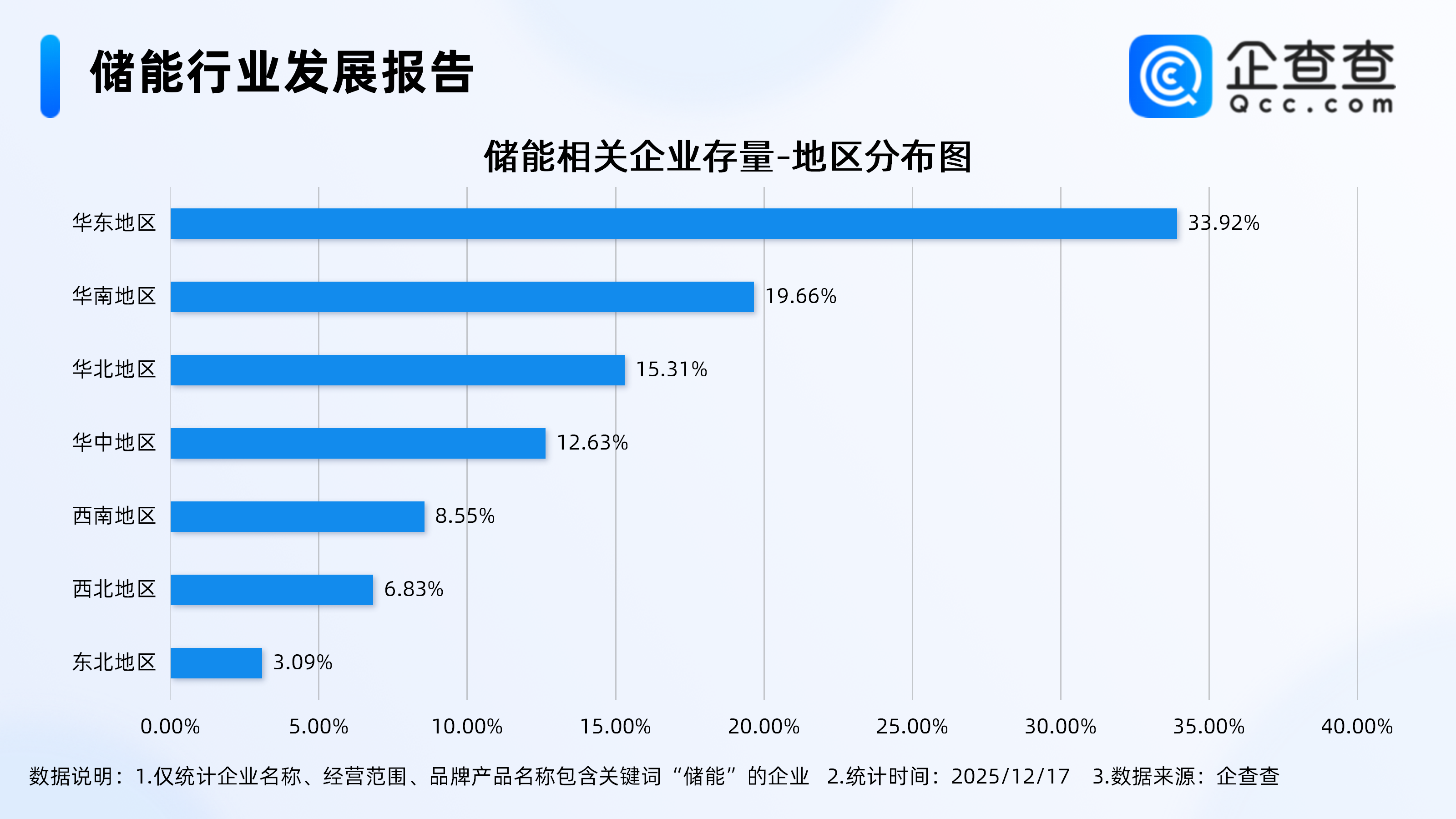 企查查数据显示,从地区分布来看,储能相关现存企业多分布在华东地区,占比达33.92%。其次,分布在华南地区、华北地区的储能相关企业分别占比19.66%、15.31%。
