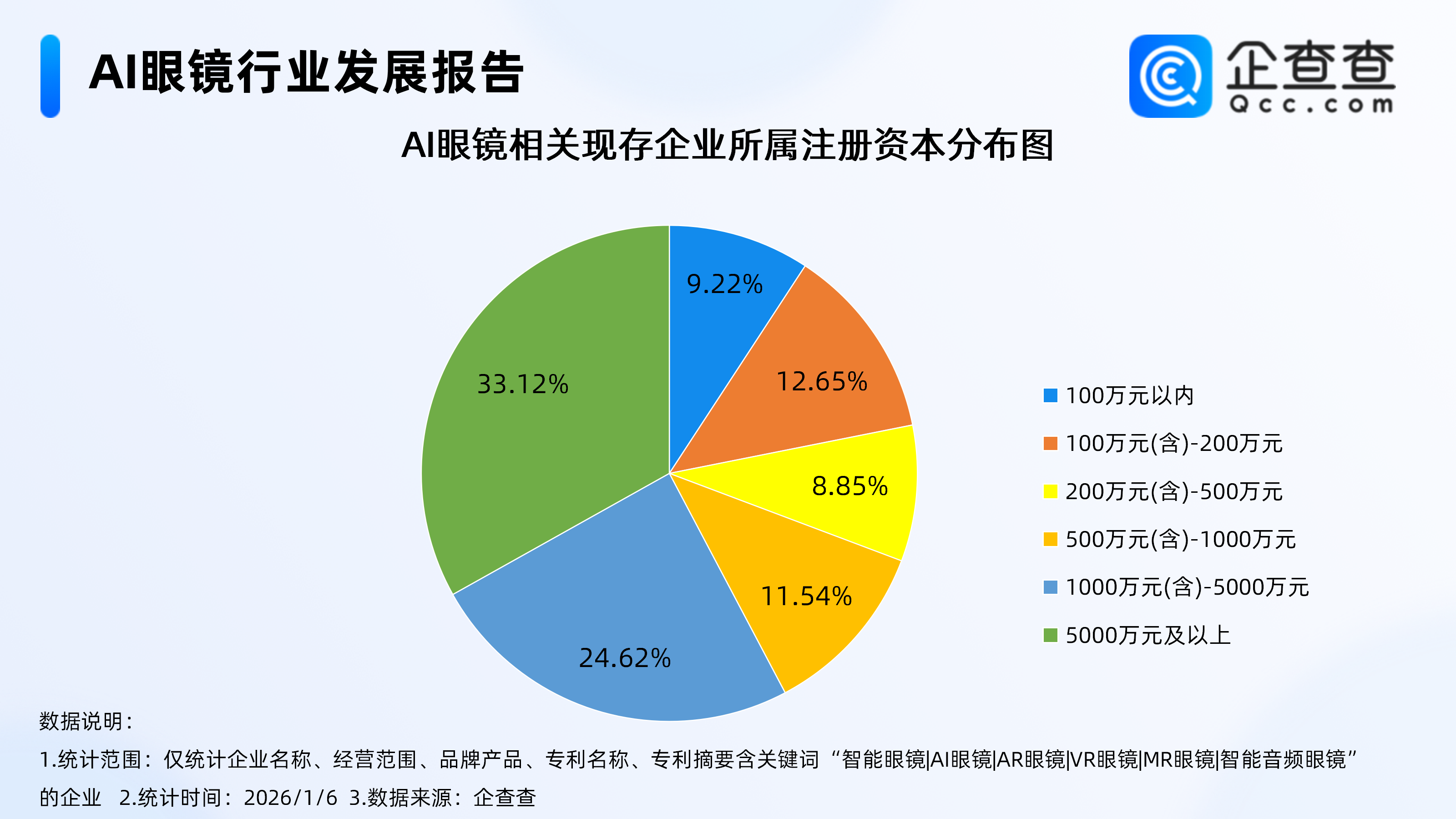企查查数据显示,注册资本方面,国内AI眼镜相关现存企业中,近6成相关企业注册资本在千万元及以上,其中注册资本在5000万元及以上的相关企业最多,占比达33.12%。