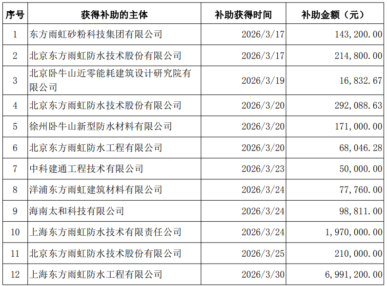 3月31日,东方雨虹(002271)发布公告,公司下属子公司上海东方雨虹防水工程有限公司获得政府补助金额为699万元。
