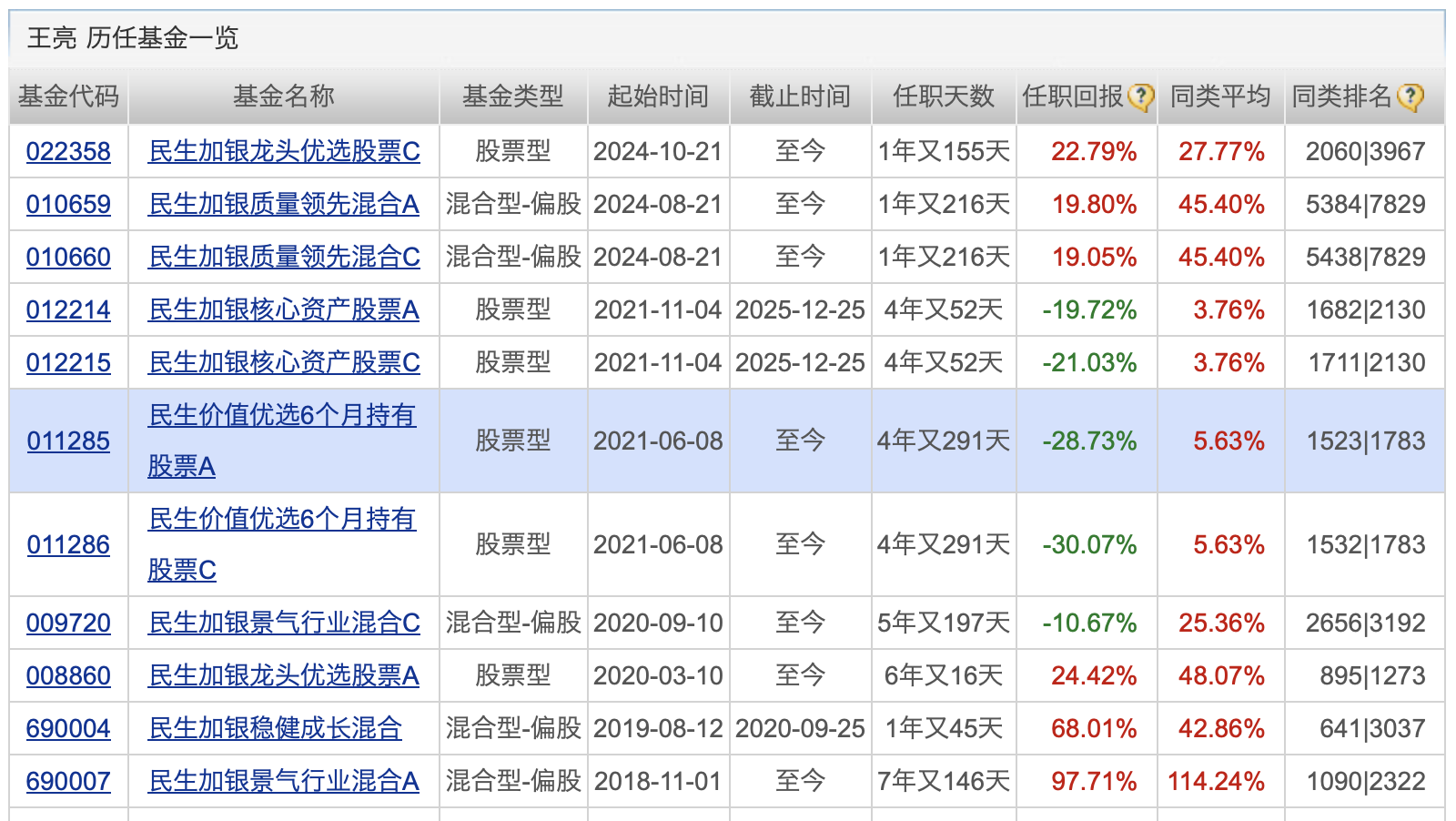 研究部总监王亮的表现同样难言乐观。尽管王亮在近期季报中强调其配置思路围绕“业绩稳定增长且乐于回馈股东的公司”,并表示对资源品价格乐观,但其管理的产品长期业绩依然承压。相关数据显示,其当前管理的产品业绩均不如同类平均,民生价值优选6个月持有股票任职期回报亏损更是在30%左右。