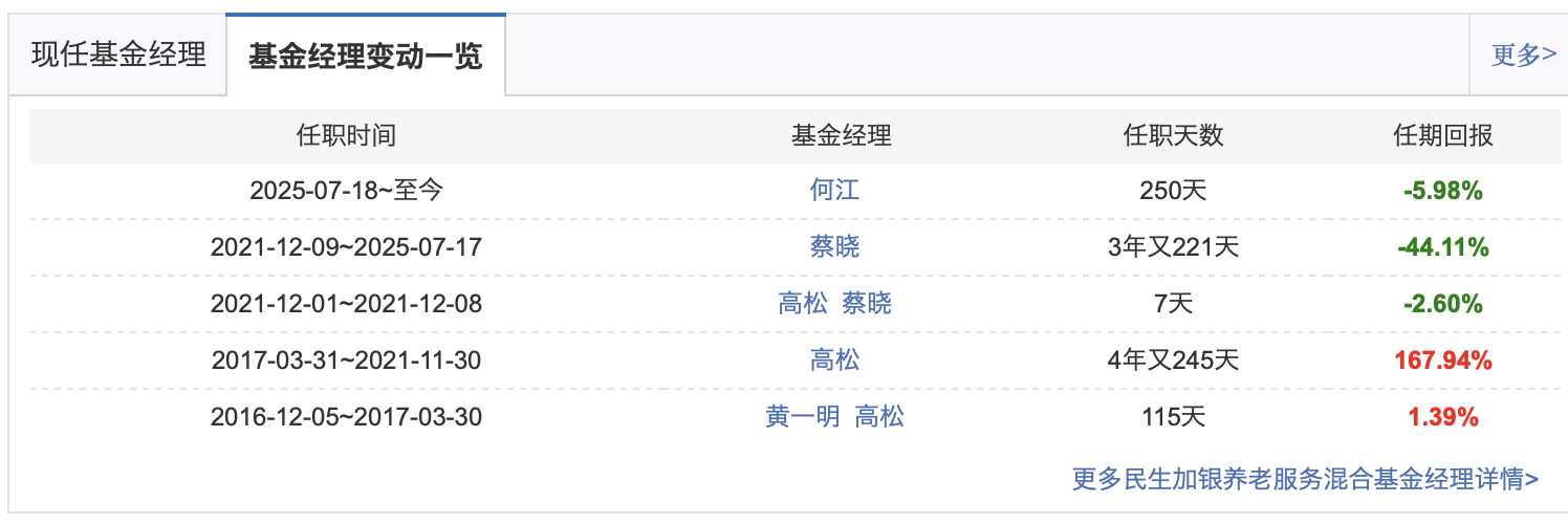 作为一只在名称中明确带有“养老”二字的主题基金,民生加银养老服务混合近五年净值跌幅高达42.22%,近三年跌幅超30%,即便在2025年以来的牛市行情中,其净值仍逆势下跌7.74%。这只本应承载着投资者养老增值期望的产品,如今沦为基民口中的“亏损重灾区”。